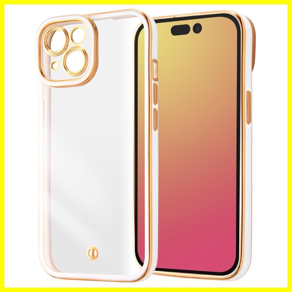 iPhone15 ケース クリア メタル フレーム カメラ保護 耐衝撃 メッキ加工 ストラップホール 付き アイフォン 15 カバー/ホワイト/ゴールド