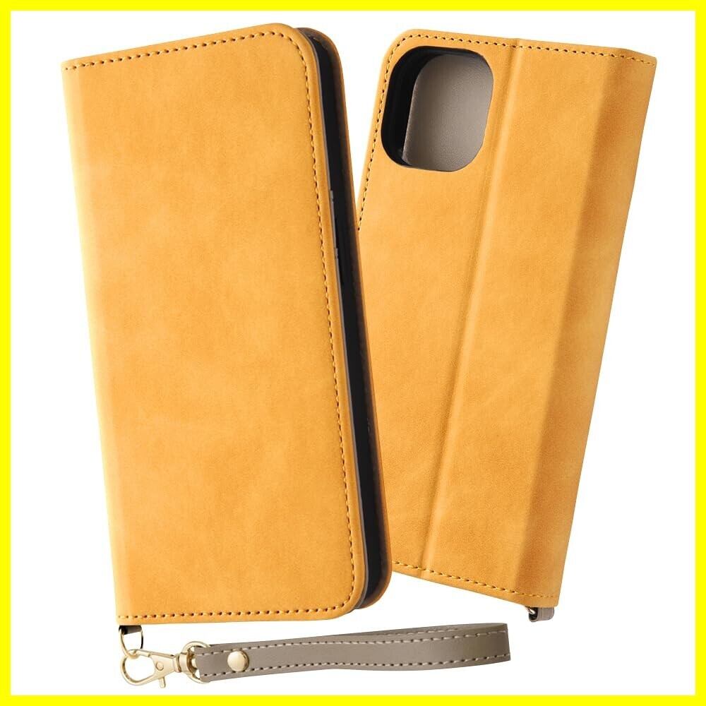 iPhone15 ケース 手帳型 ハンドストラップ付き マグネット無し スタンド機能 カード3枚収納 アイフォン 15 カバー/イエロー