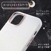 特殊なラメ加工を施したキラキラと綺麗な素材感のケース。サイドボタンやカメラ周りなど統一感のあるメタリックパーツ。内側はやさしく端末を守るマイクロファイバー素材。ラメ塗装ですが表面はツルっとした仕上がりです。メタリックカラーの上に大小ランダムに数色のラメを取り入れてみる角度によって色味、煌めき具合が変わりキラキラと華やかに演出してくれます。