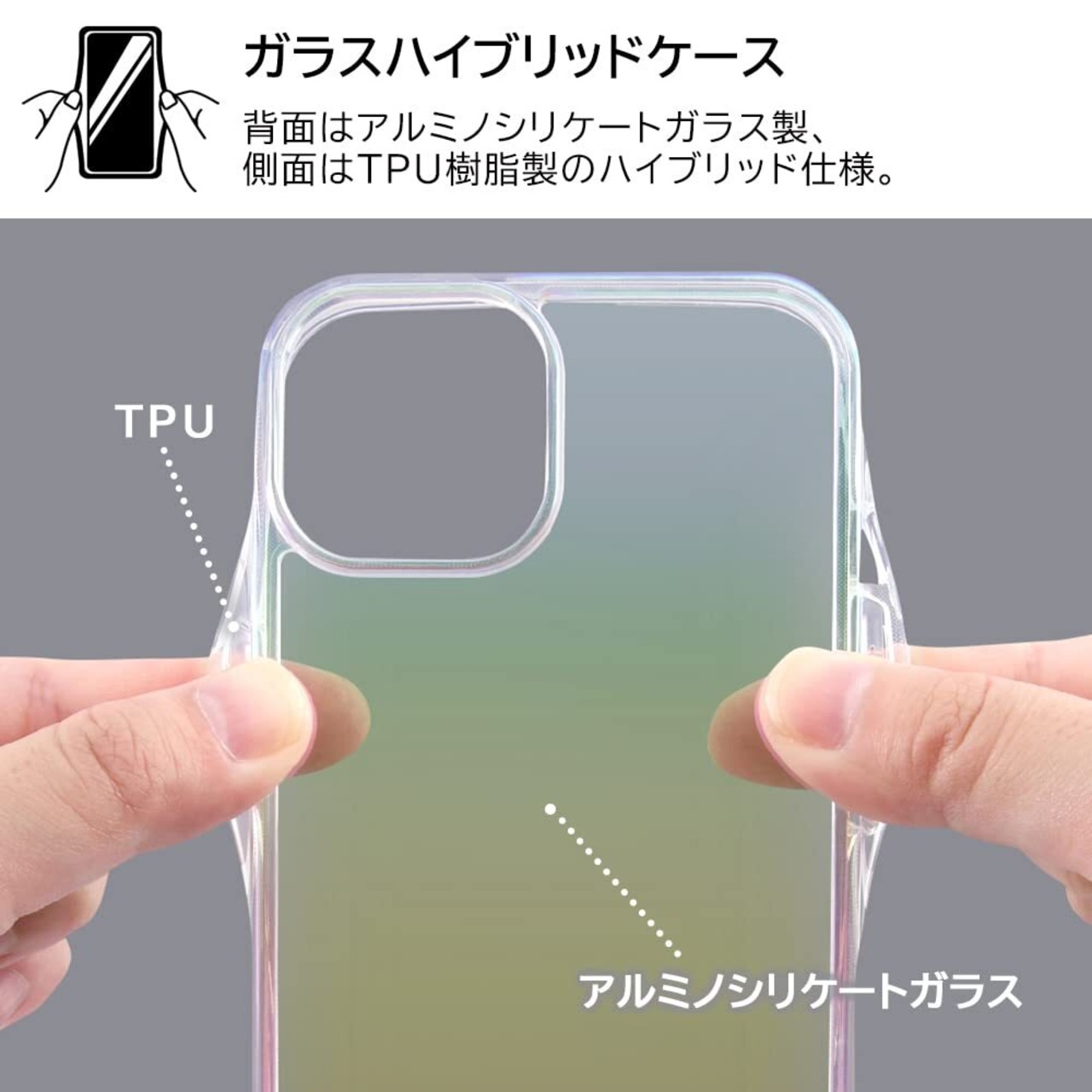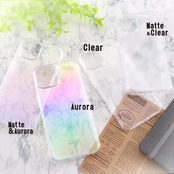オーロラ、レインボーとも例えられる見る角度によって色目、表情を変える、強く美しいガラス素材を背面に採用した耐久性、透明度に優れたクリアケース。