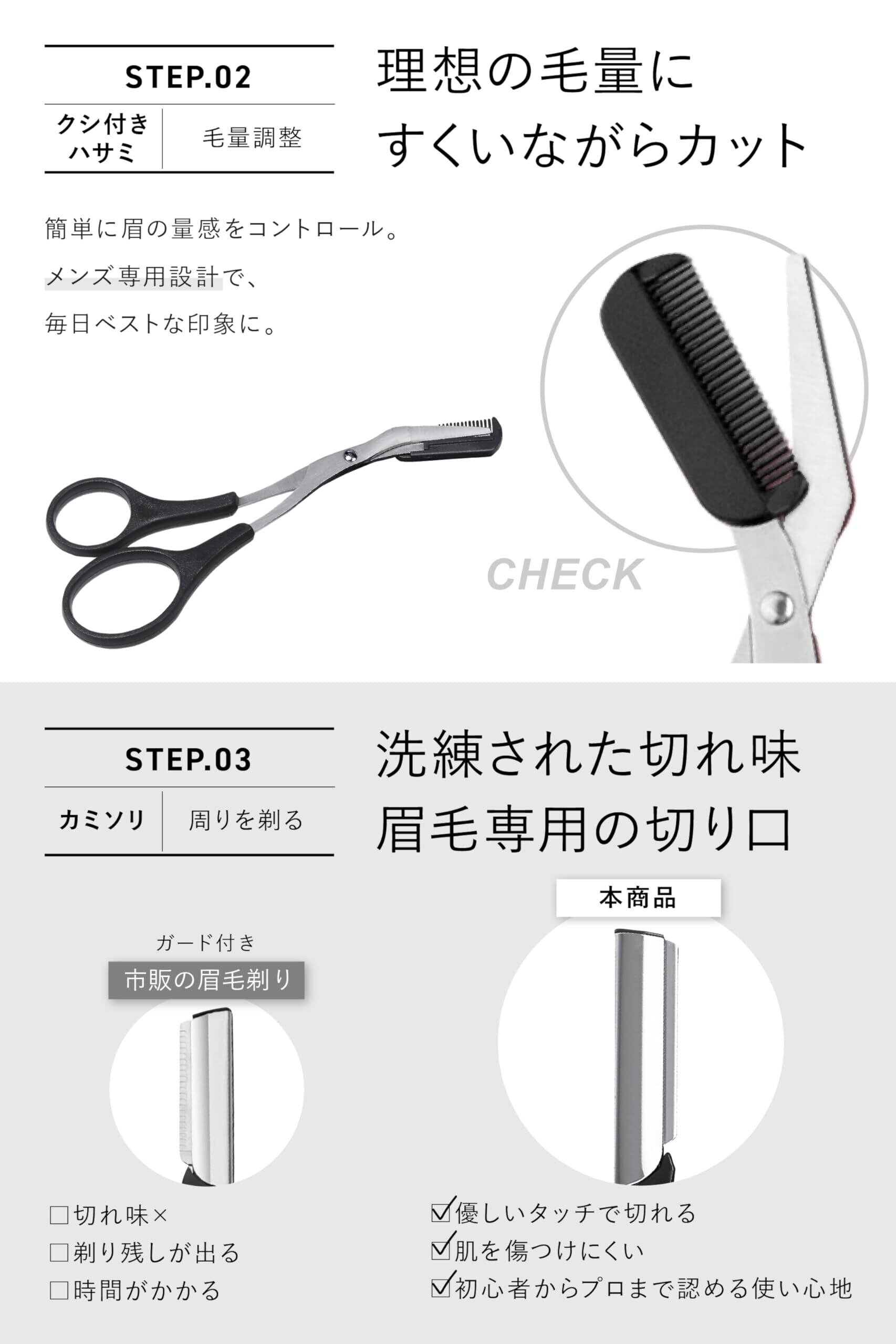 [Omahit] 眉毛 ハサミ はさみ メイクアップセット 眉毛剃り 毛抜き くし 顔剃り メンズ 説明書付 表参道メンズ美容師監修 (ブラック)