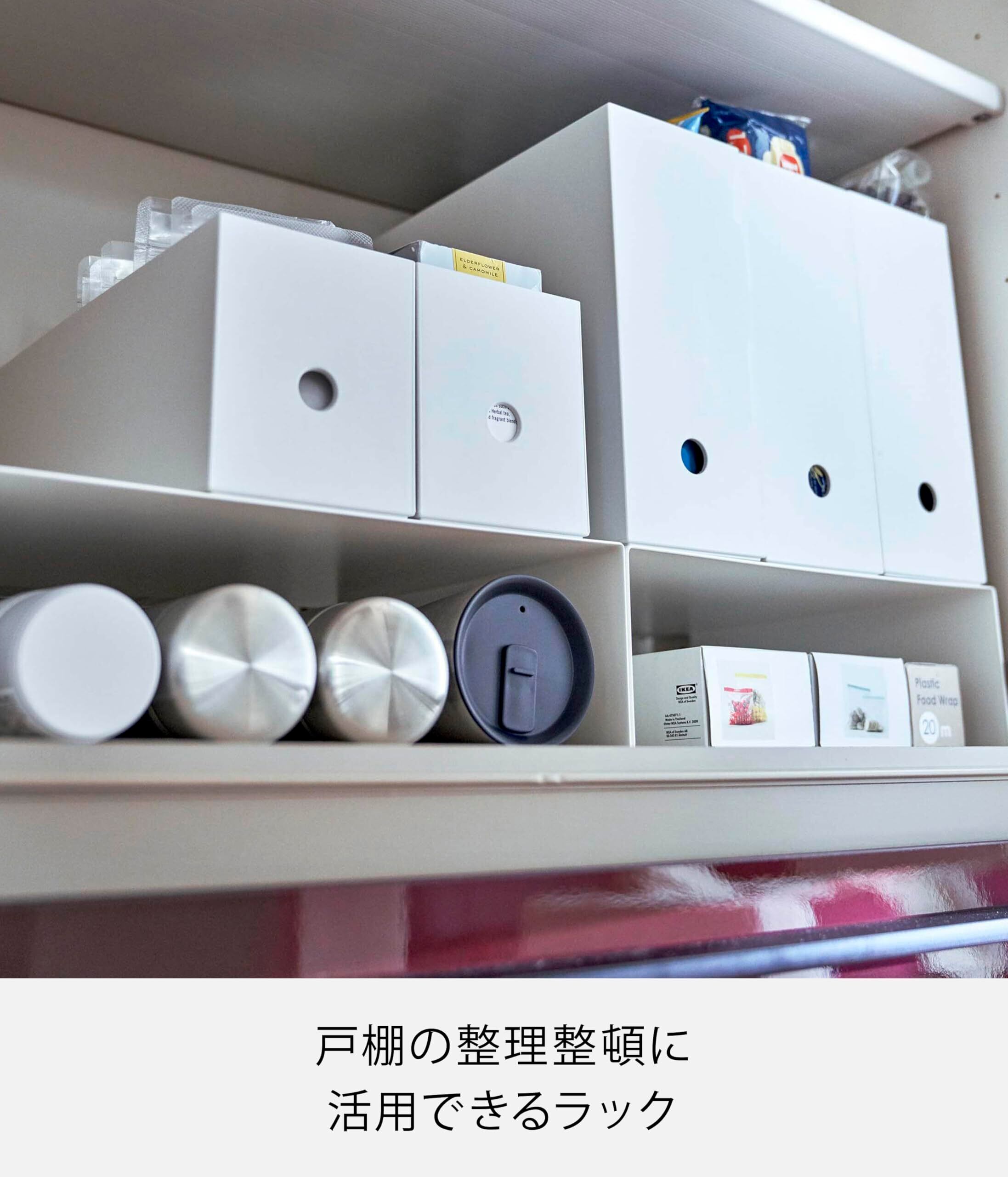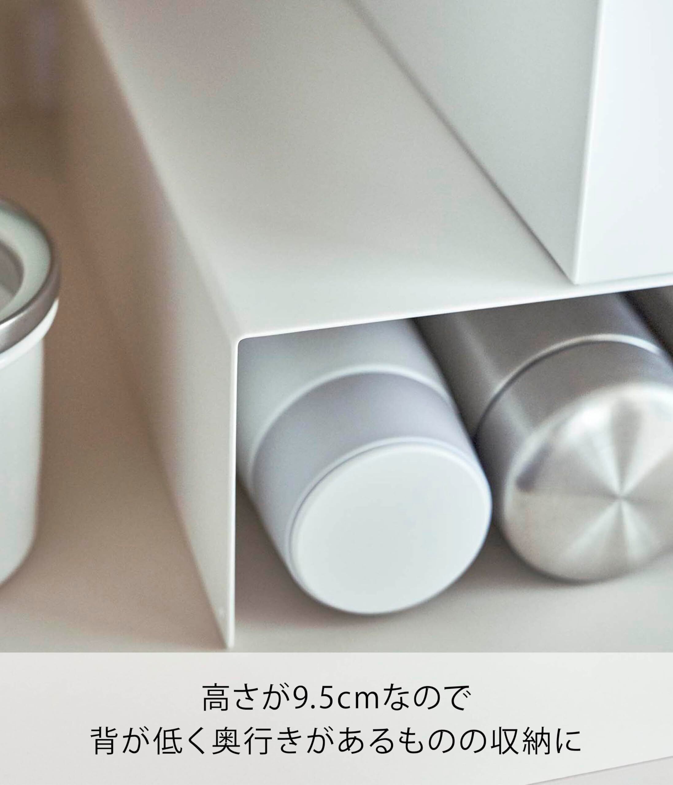 収納ボックスの下のスペースを有効活用。マグボトルなどの収納に便利な2個組のラック。食器棚や戸棚下、パントリーなどでマグボトルやフリーザーバッグのボックスなどを収納するのにピッタリなラックです。高さが約9.5㎝なので背の低い奥行があるものの収納に最適です。