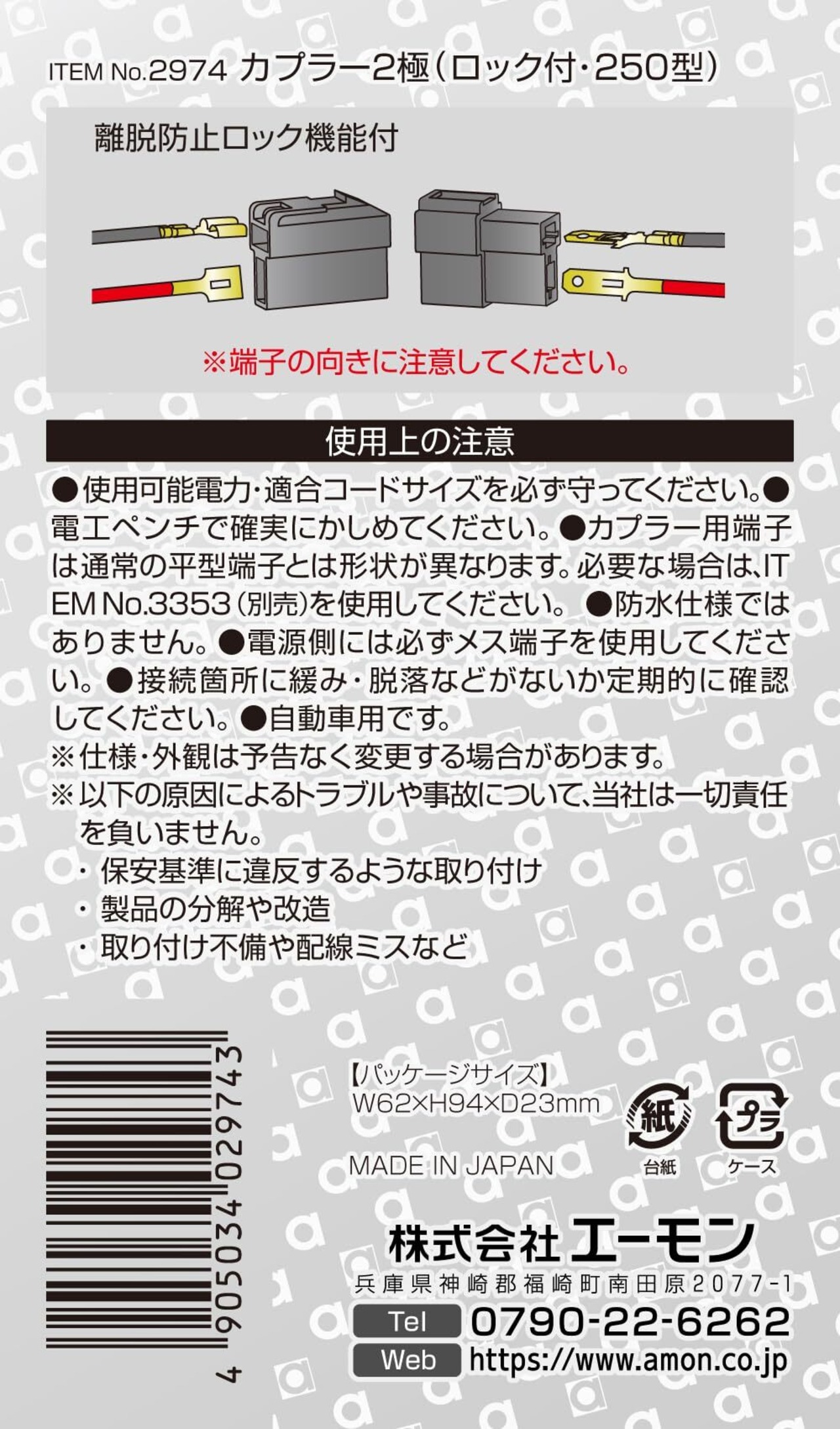 エーモン(amon) カプラー2極(ロック付) 250型 3セット 適合コードサイズ AV(S)0.5~2sq 2974