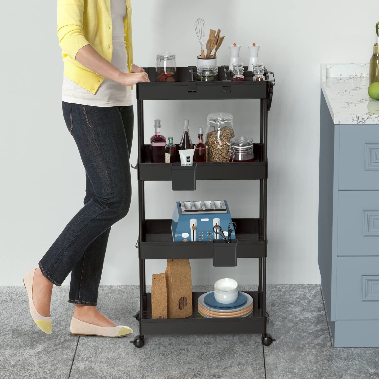 SPACEKEEPER キッチンワゴン 隙間収納 スリム 22cm 収納カップ 仕切板付き 多機能 小物 食品 調味料 キャスター付き 組立簡単 浴室 台所 冷蔵庫横 4段 ブラック