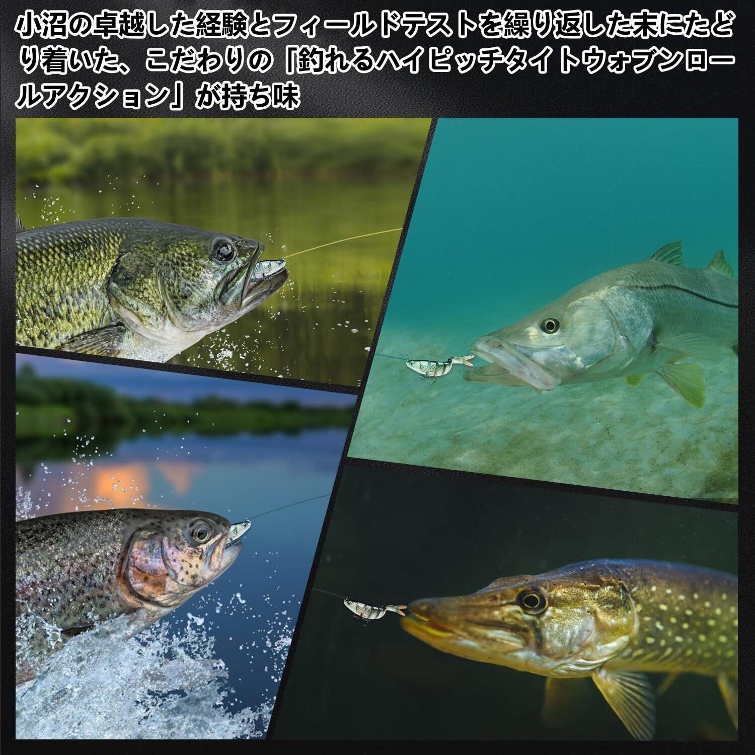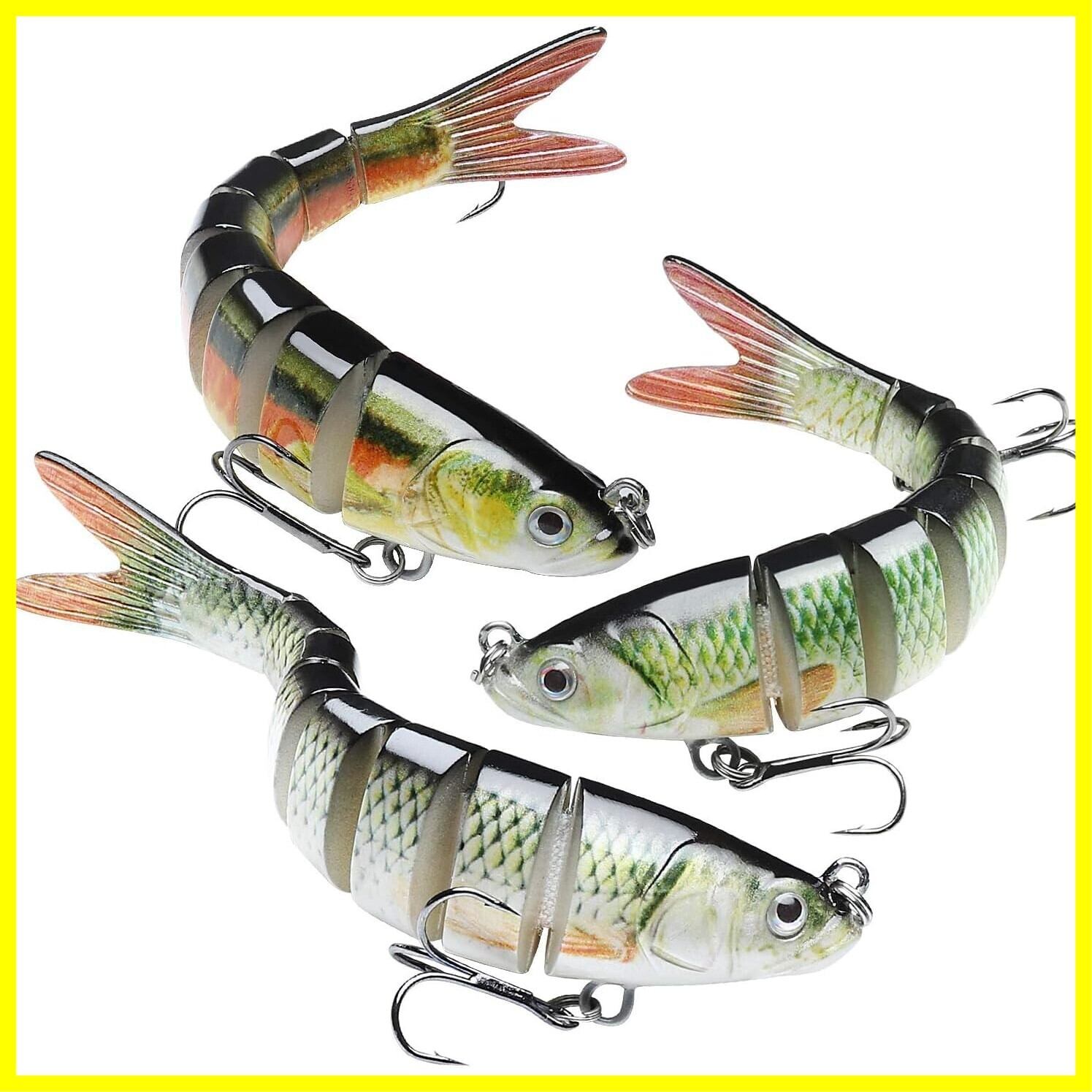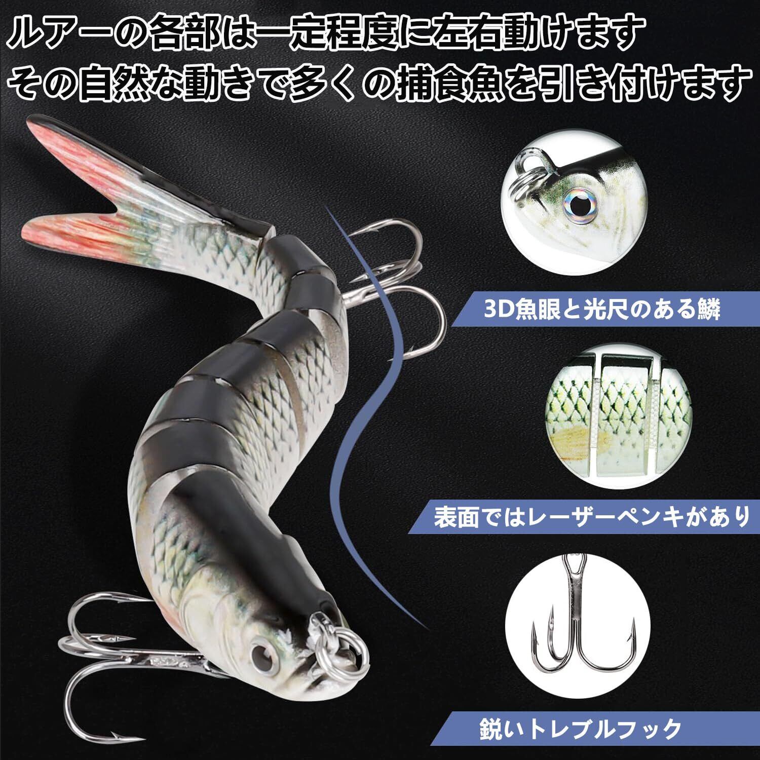 【高いシミュレーション】ABS素材で作られた本物に近い3D魚眼と光沢のある鱗を持つスイムベイトは、実際の魚の色や模様を巧みに再現します、外観からも本物の小魚ように生き生き見えます。ターゲットにしている魚も騙されてしまい、釣果が上がります。また、飛行時にジョイント部の可動域を制御する事は比較的簡単に出来ます。しかし、着水と同時に可動域が復元される。