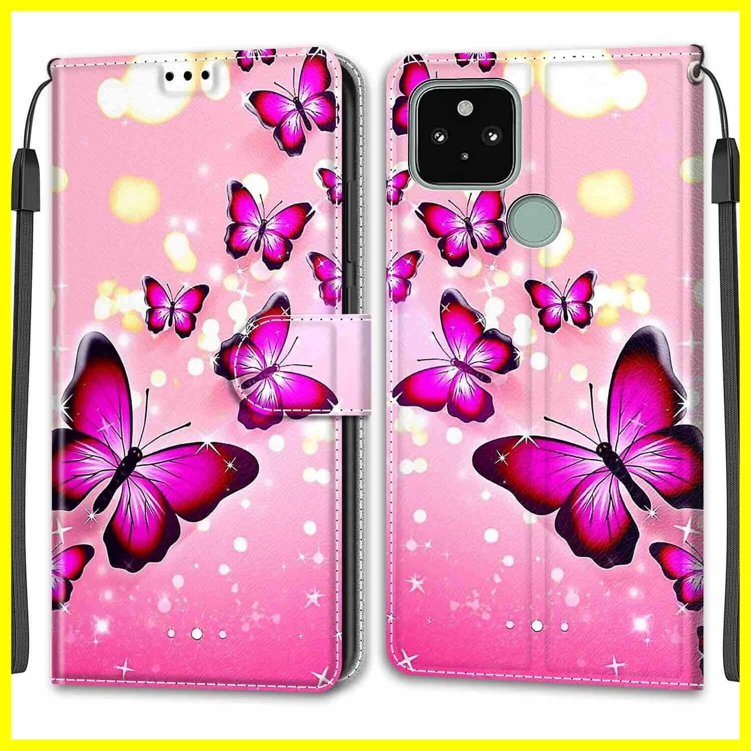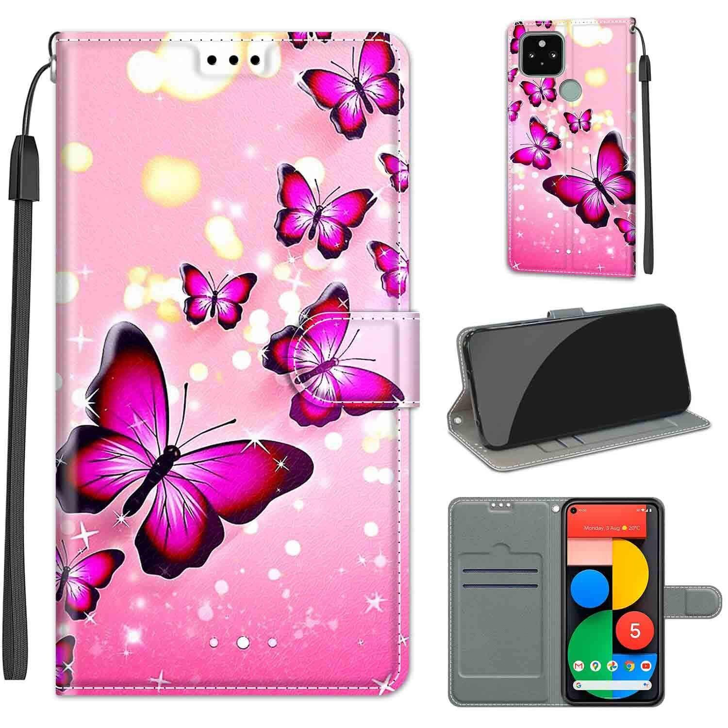 KENHONER Google pixel 5 ケース 手帳型 pixel5 ケース au SIMフリー 全対応 カバー グーグル ピクセル 5 スマホケース ピクセル5 手帳型 適用 case 内蔵マグネット 携帯カバー カード入れ スタンド 機能 ピンクの蝶