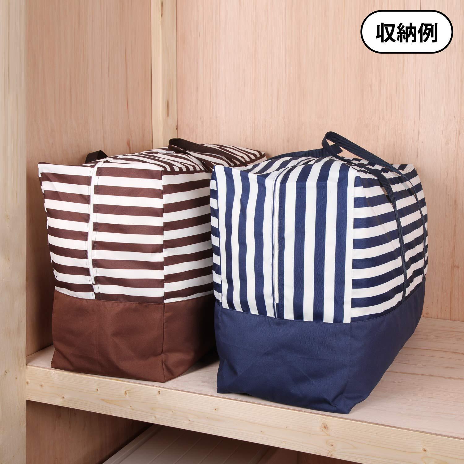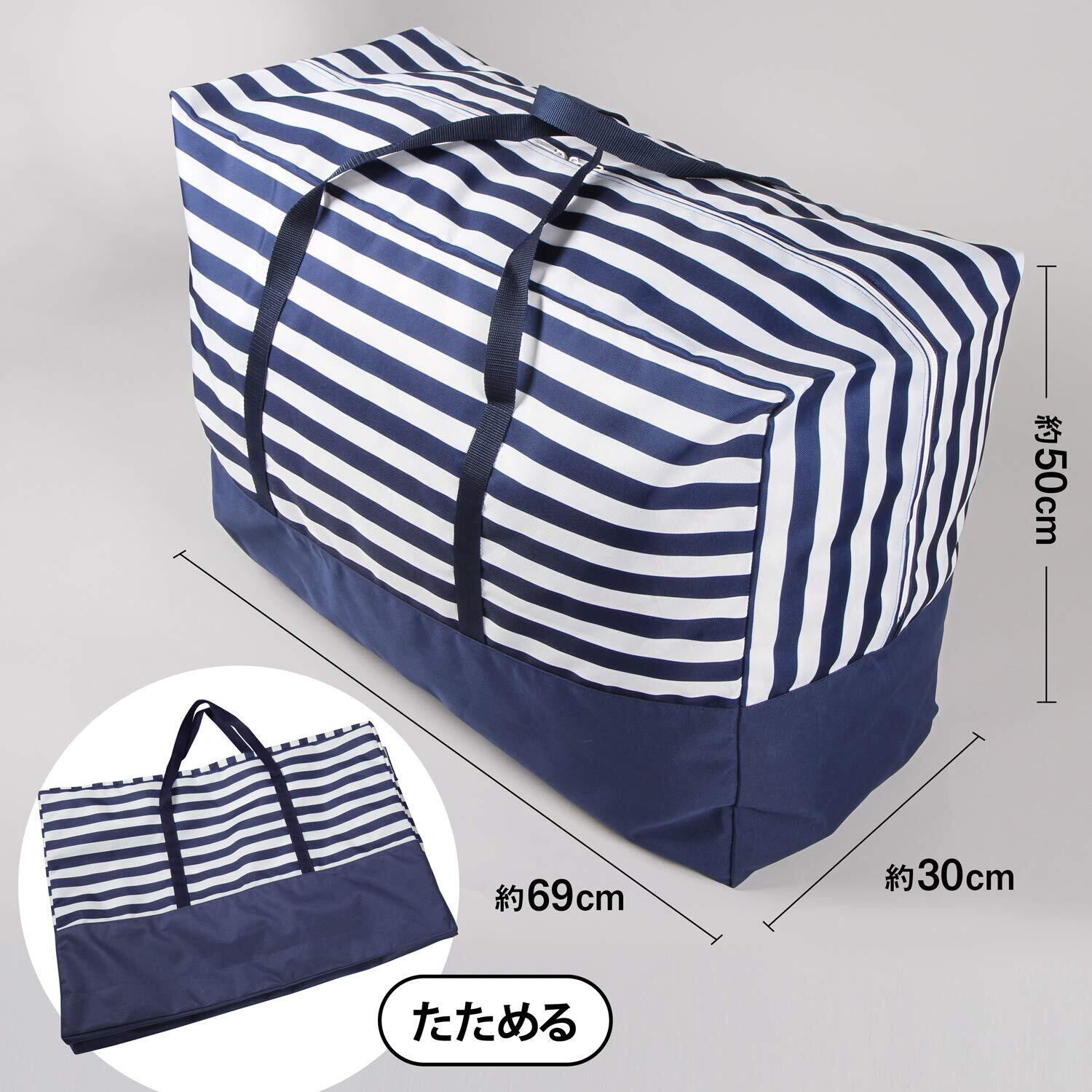 【商品仕様】:サイズ/約幅69x奥行30x高さ50cm、カラー/ネイビー、柄/ボーダー、内容/1個、収納目安/シングルサイズもしくは、ダブルサイズの羽毛布団:約1枚、材質/ポリエステル