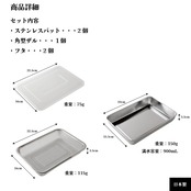 ●セット内容:バット×2、フタ×2、角型ザル×1、取扱説明(個装箱裏面)●本体サイズ(約):バット/幅22×奥行 15.5×高さ 3.5cm、フタ/幅 22.5×奥行 16×高さ 1cm、角型ザル/幅22.5×奥行 16×高さ 3.5cm●満水容量(約):900mL●材質:バット・角型ザル/ステンレス鋼、フタ/ポリエチレン(耐熱温度:80℃・耐冷温度:-20℃)●重量(約):バット/150g、角型ザル/115g、フタ/75g●原産国:日本