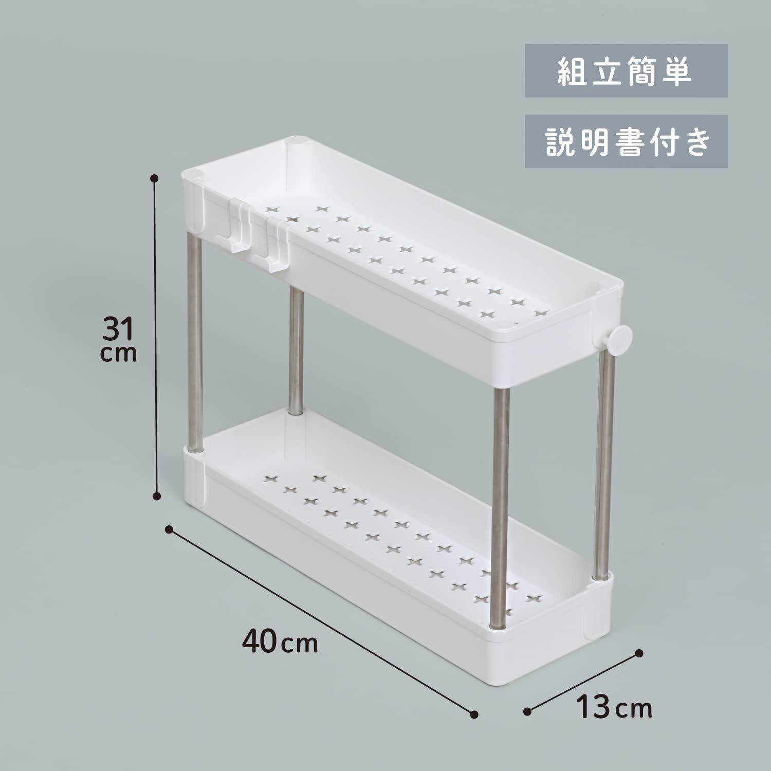 【商品仕様】:サイズ/約幅13×奥行40×高さ31cm、カラー/ホワイト、内容/1台、耐荷重/トレイ1枚につき約3kg、材質/ポリプロピレン・ステンレス