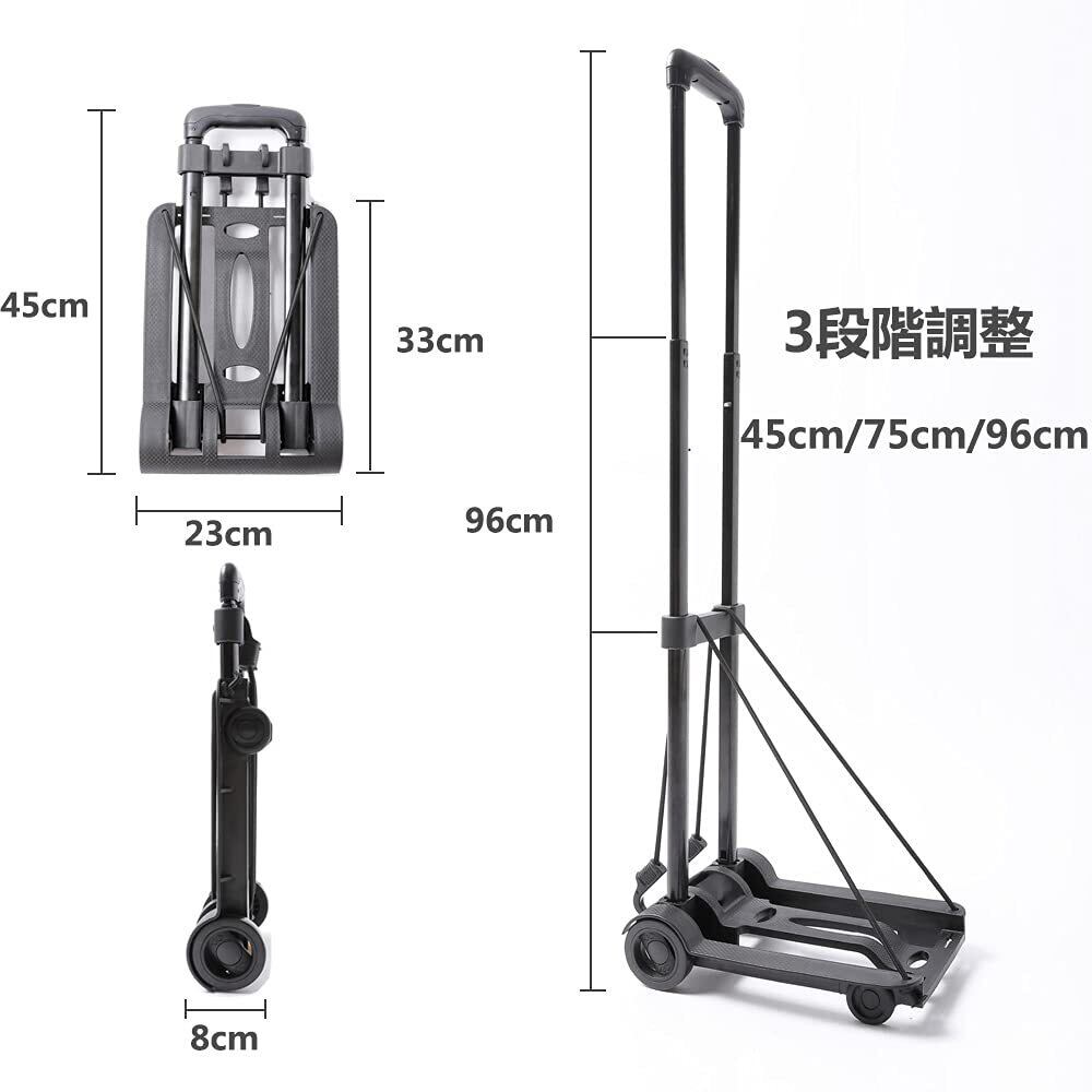 ●台車本体サイズ:33*23*96cm(使用時)、 23*45*8cm(収納時) 荷台サイズ:23*33cm、ハンドル3段階調整:96/75/45CM。