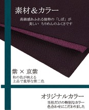 【男女両用 オリジナルカラー】 ふくさ「紫×京紫」の2色使いは、落ち着いた上品な和の印象。 当社だけのオリジナルカラーでご用意しています。 格調高く、おしゃれな色使いで、男性、女性を問わず、慶弔どんな場面でも安心してお使い頂けます。