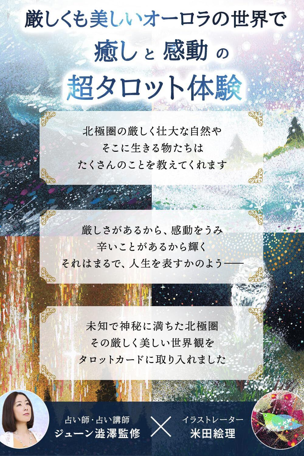 【ジューン澁澤監修】オーロラが降り注ぐ極北の世界をモチーフにした、ジューン澁澤氏考案の日本製オリジナルタロットカードです。神秘のエネルギーを浴びて生きる“最果ての大自然”が描かれた42枚のカードには、心震えるほどに真実を見抜き、光り輝く未来へと導く“奇跡の力”が宿っています。