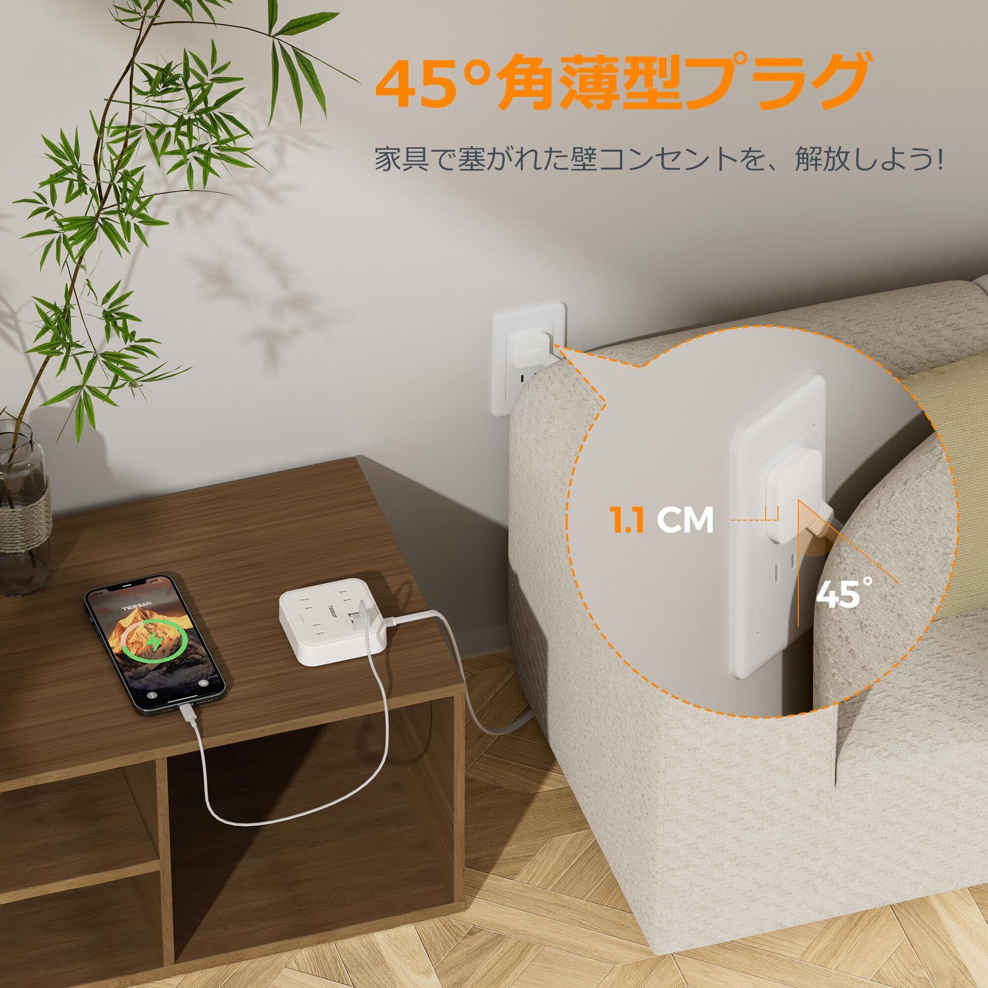 【電源タップ 薄型】延長コード 2m 薄型と薄型プラグの採用により、狭い隙間にも簡単に設置可能です。家具の後ろや壁際でも、スペースを有効に活用できるため、見た目もすっきりします。それに、L型プラグを壁のコンセントに差し込んだときに他のコンセントを妨げません。