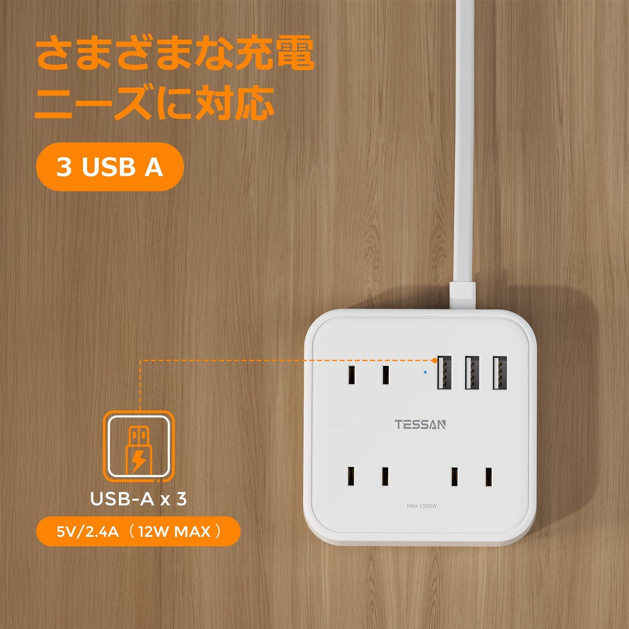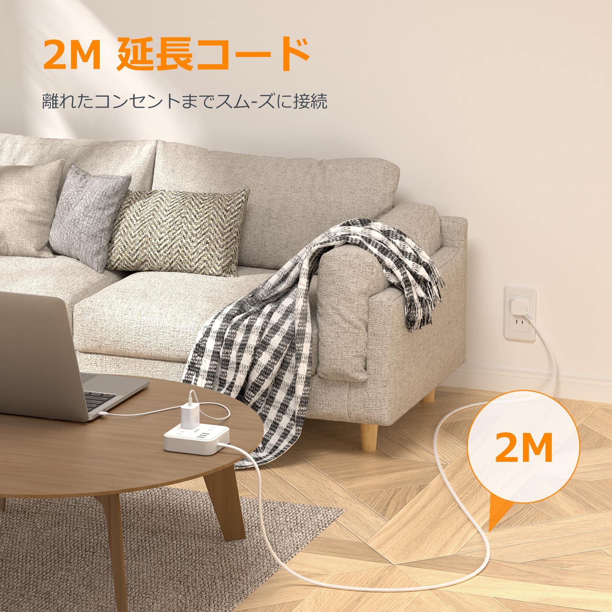 【2M延長コード付のマルチタップ】:延長コード 2mで、コンセントから離れた場所でも給電できる!また、TESSANのケーブルタイプには、耐熱性に優れたユリア樹脂二重被ふくコードを採用していますので、断線や被ふく破れによる感電・火災の防止に有効です。