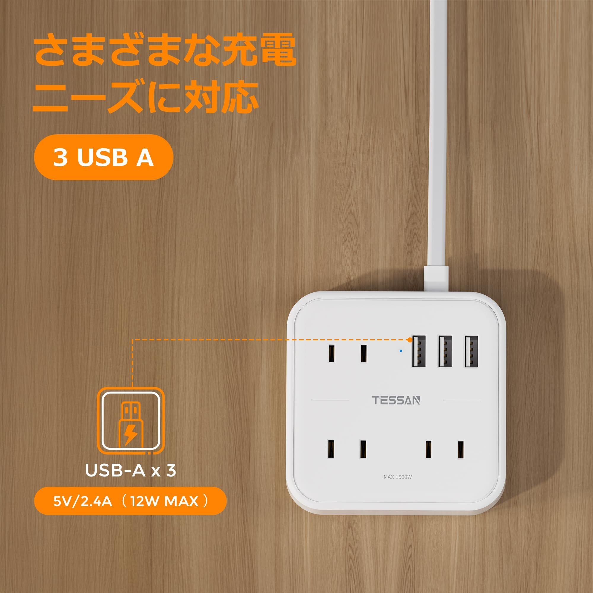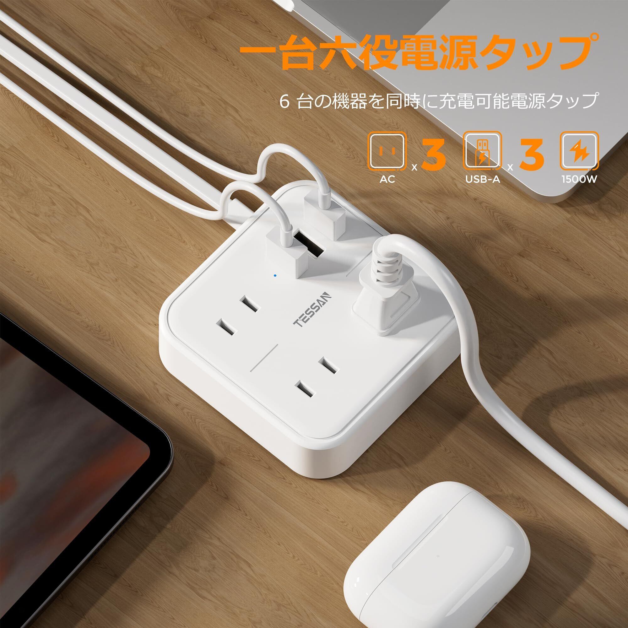 【USB-Aポート付の電源タップ】:3個AC差込口 と3つUSBポートあり、スマホ、パソコン、デジカメ、ゲーム機など、あらゆる機器を最大6台同時に充電できる。