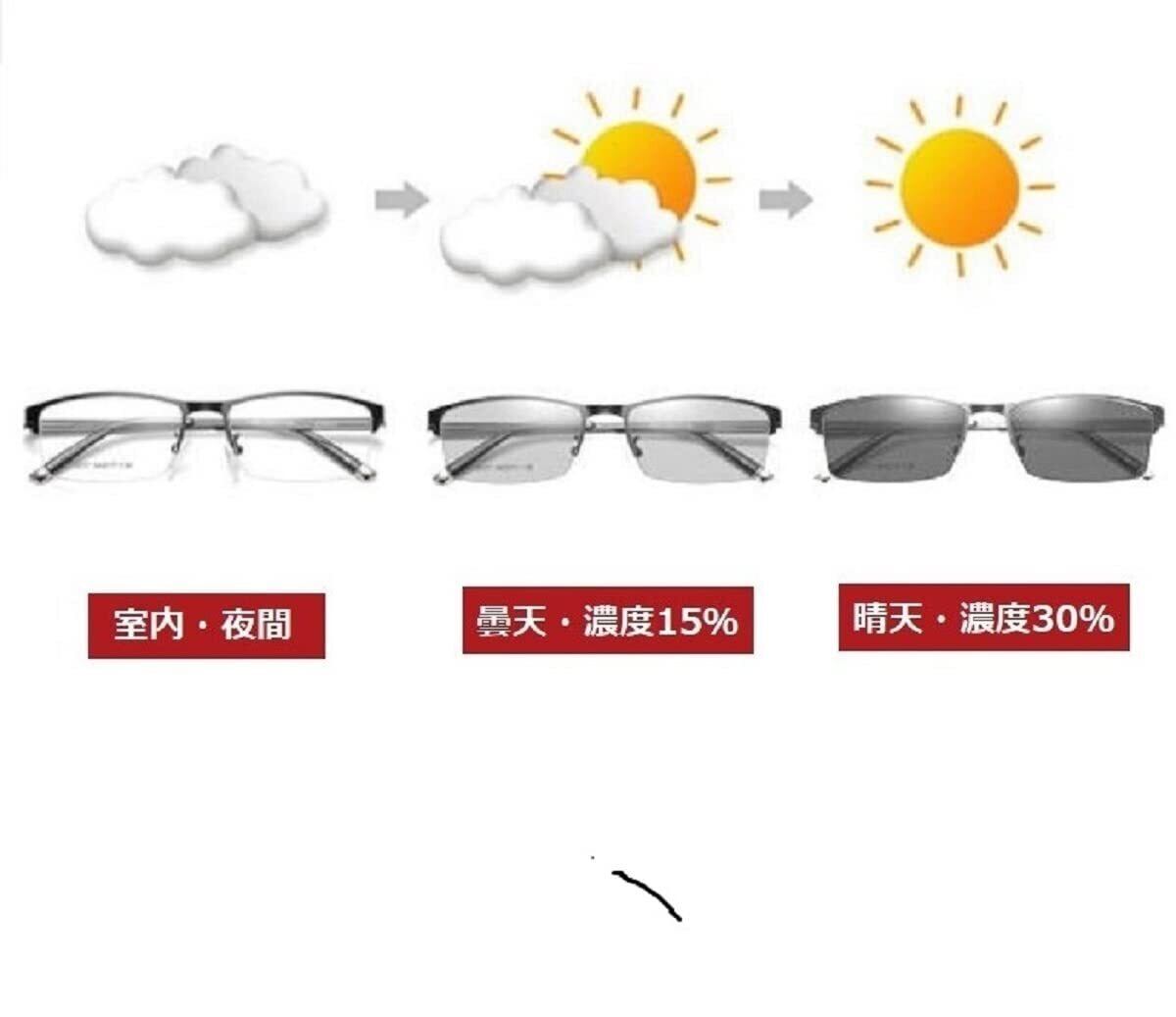 【調光変色機能】室内でのクリアレンズ状態の濃度はほぼ透明と感じる約5%です。(ブル―ライトカット加工が施してあるためよく見るとイエロー味がかっています) 外出時の晴天下では約30%の濃度まで変色いたします。これは目が見えなくなるほどの濃さ(約60%)ではなく、ライトグレーへの変色で、今トレンドでタレントさんなどの着用が良く見受けるソフトカラーサングラスタイプ変色です。 (また、良く勘違いされる方がおられるのは、運転時に変色しないということですが、ほとんどの車はウインドウガラスに紫外線カットの加工が施してあるため、紫外線調光のメガネが変色することはありません。あくまでの戸外日光下での変色となります。)