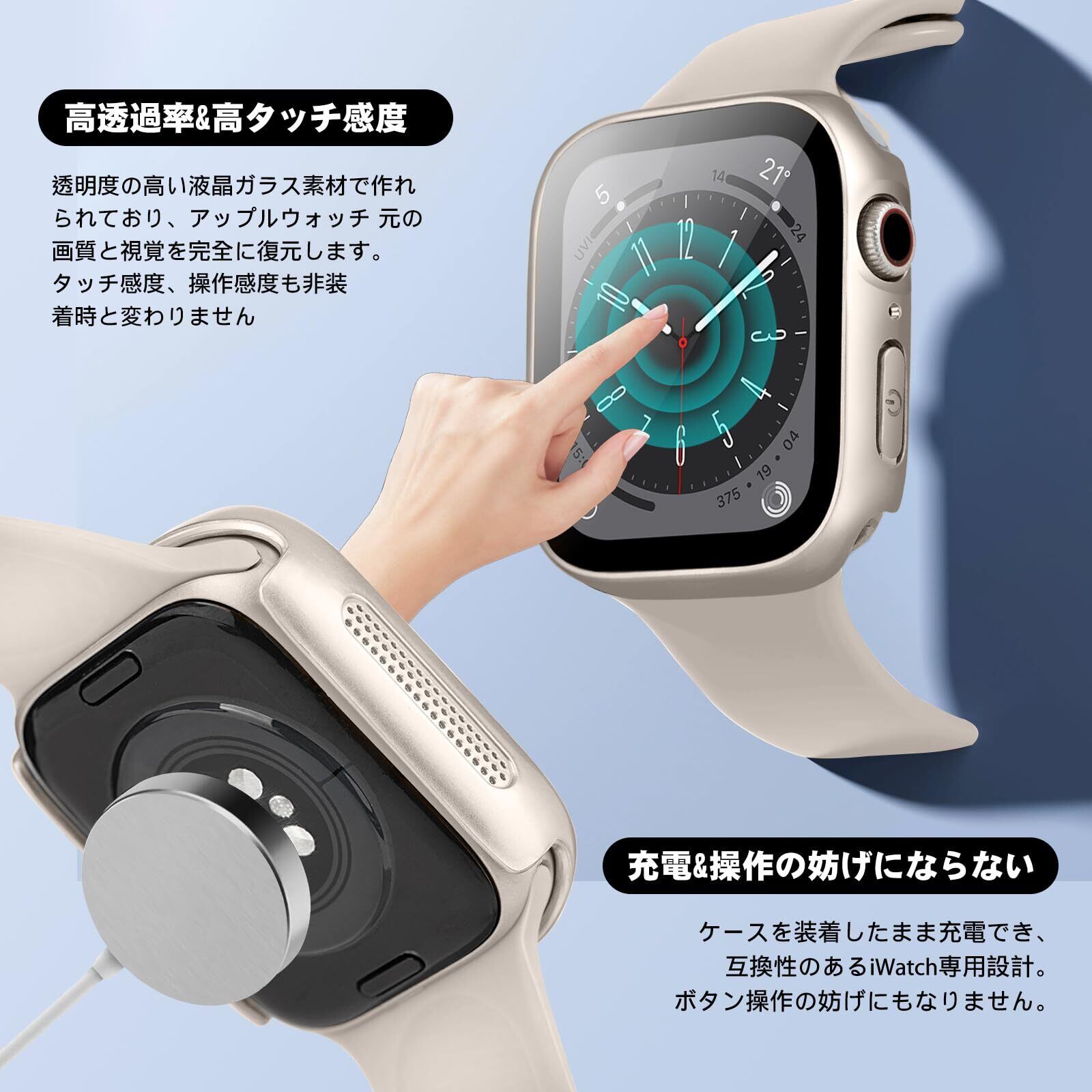 【高透過率・高タッチ感度】 硬度9Hと強靭な液晶部保護フィルムで、外部の衝撃から大切なアップルウォッチを守ります。また、透明度の高い液晶ガラス素材で作れられており、Apple ウォッチ 元の画質と視覚を完全に復元します。このアップルウォッチ カバーをつけたまま、タッチスクリーンに直接触れ、スピーカーやマイクもすべて簡単にアクセスできます。各ボタンは高いタッチ感度を提供して、スムーズで快適な操作を実現します。