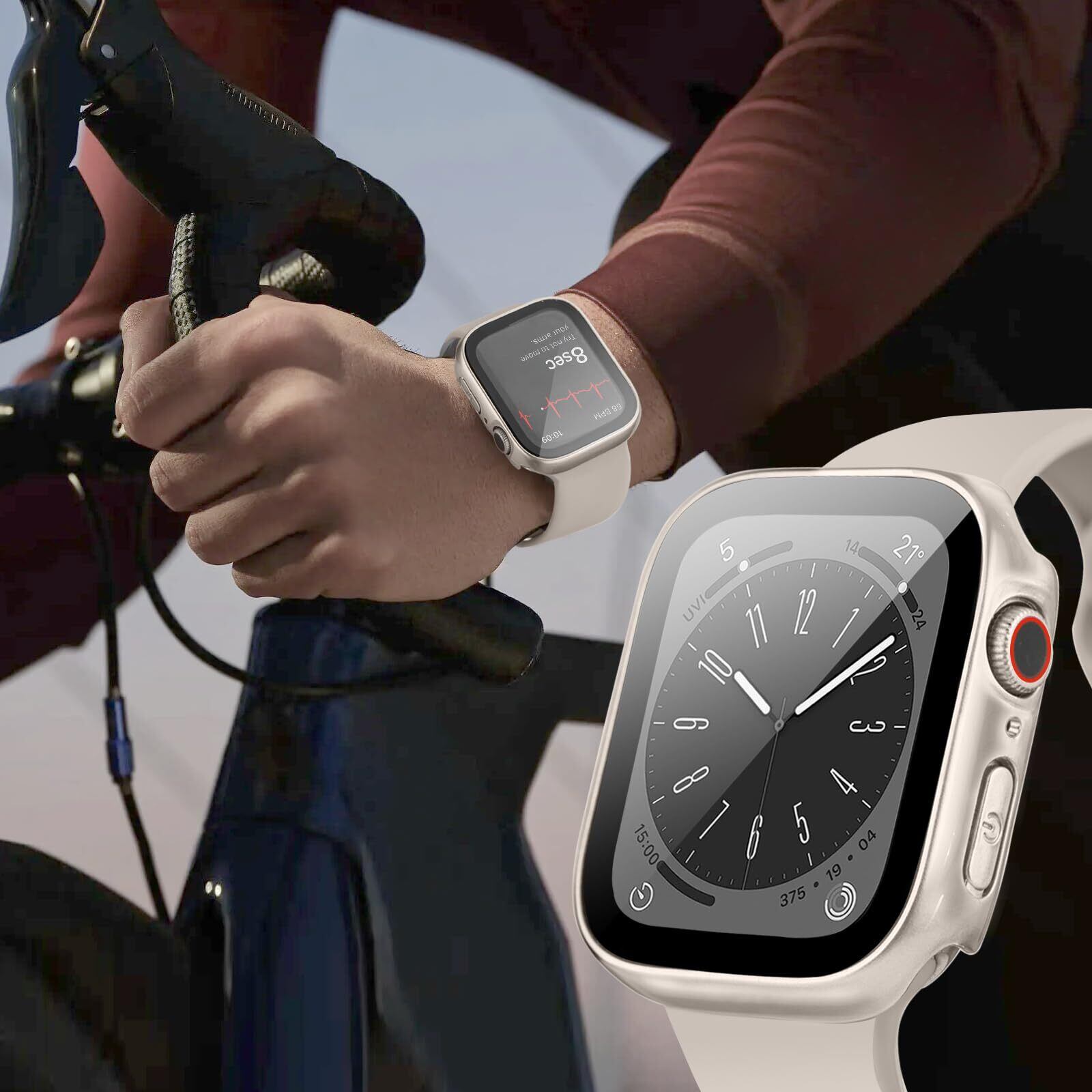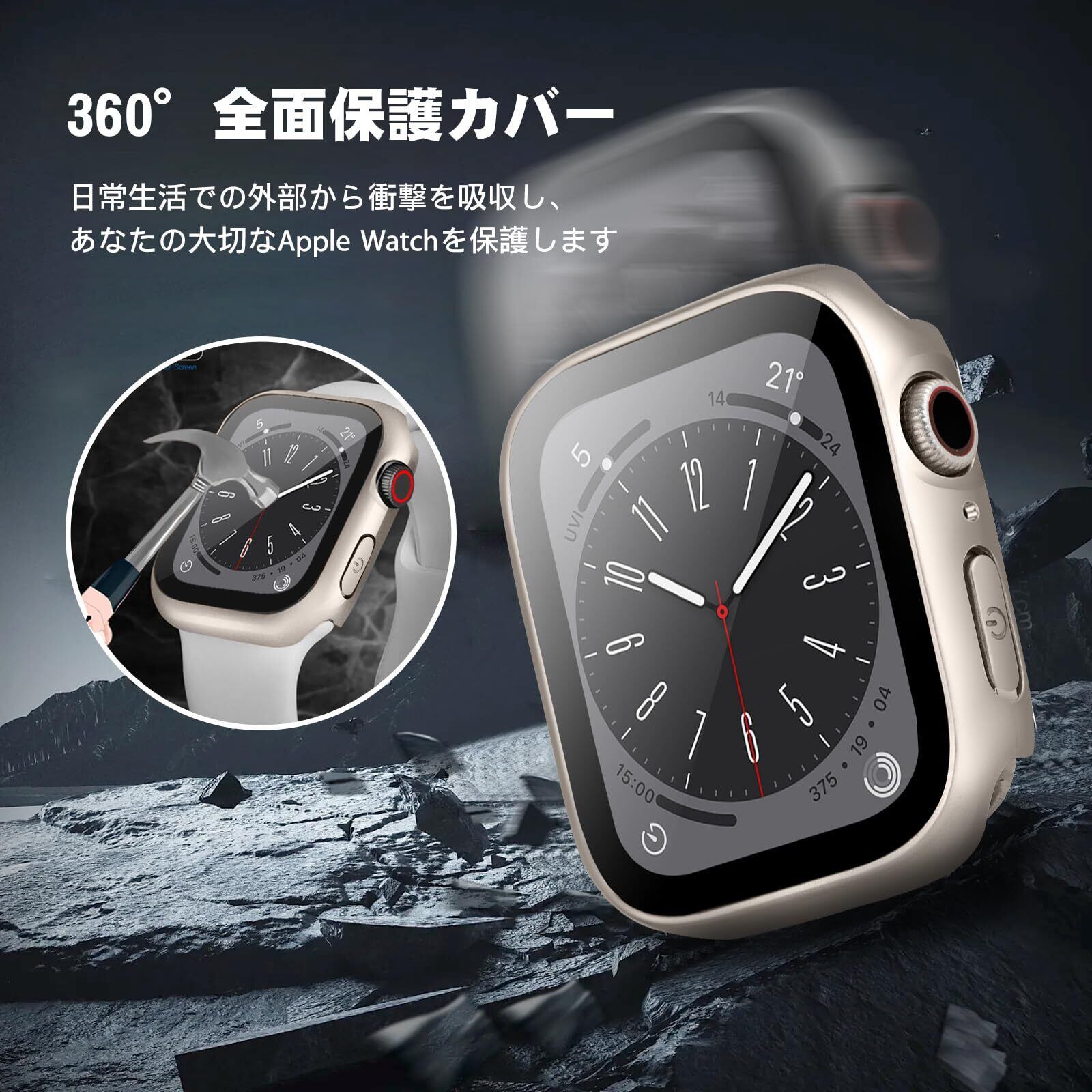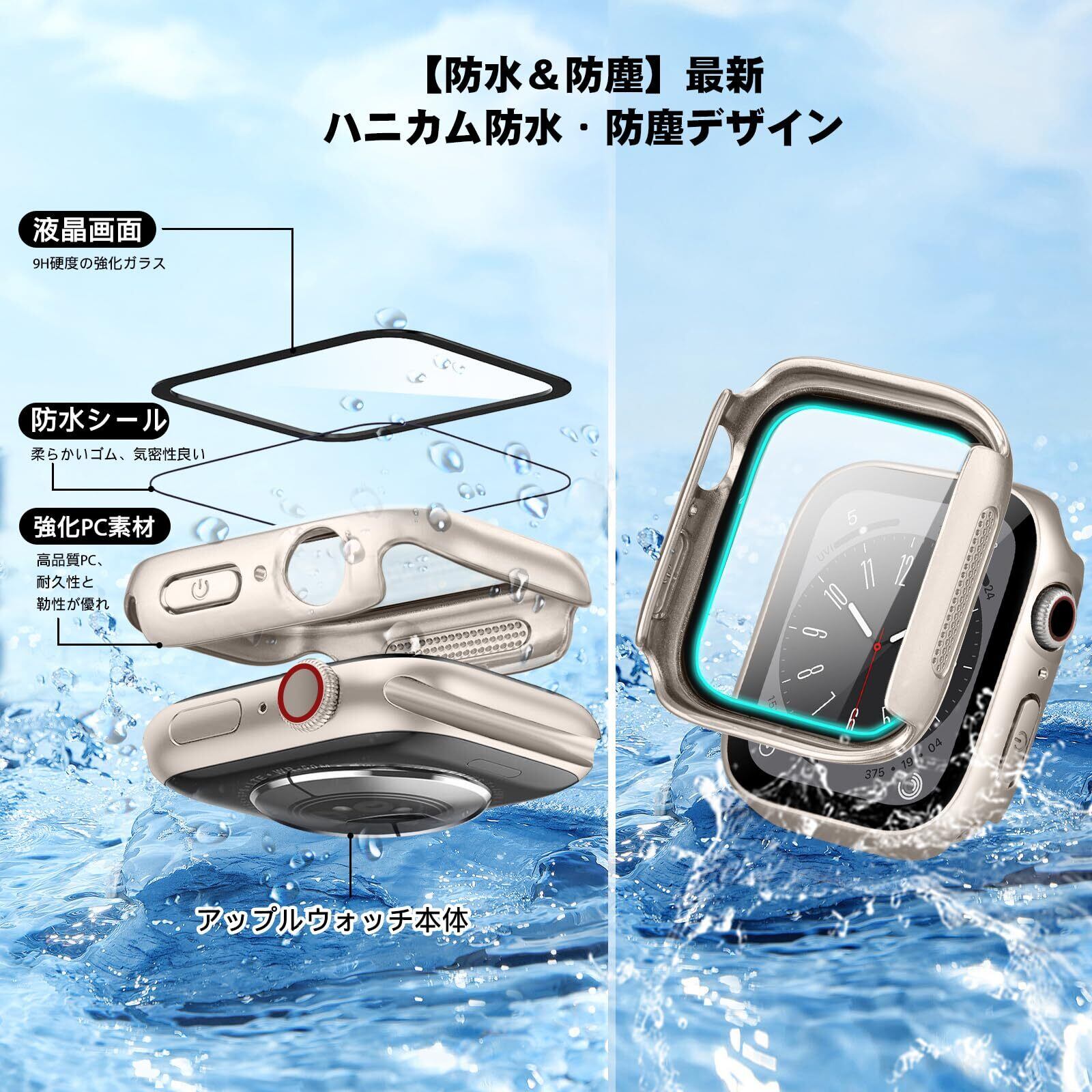 【防水&防塵】最新ハニカム防水・防塵デザイン。シーリングリング内蔵したApple Watch ケース、ウォッチ本体の画面にぴったりとフィットし、水の浸入を防ぎます、ほこりを完全に防ぎ。ケースを取り外して水を拭くすることを繰り返す必要はありません。疎水性撥油性抜群の強化ガラス表面により、アップルウォッチ カカバー面に水が溜まらず、シャワー、手洗い、発汗、運動、雨など、日常の使用に適しています。※ご注意:プールや海などの水場でのご使用時はアップルウォッチの説明に従い、スキューバダイビング、ウォータースキーなど、水圧が高くなったり、所定の水深より深く潜るようなアクティビティはしないでください。ウォッチの画面とカバーの間に水・水霧ぎが浸入する場合、保護カバーを取り外し、柔らかい布で水を乾かしてください。