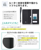 薄く肌触りがよいLOE独自のタブレットケースに用いられる本革に近い高級PUレザーを用い、ルーター本体を衝撃や傷からソフトに守ります。