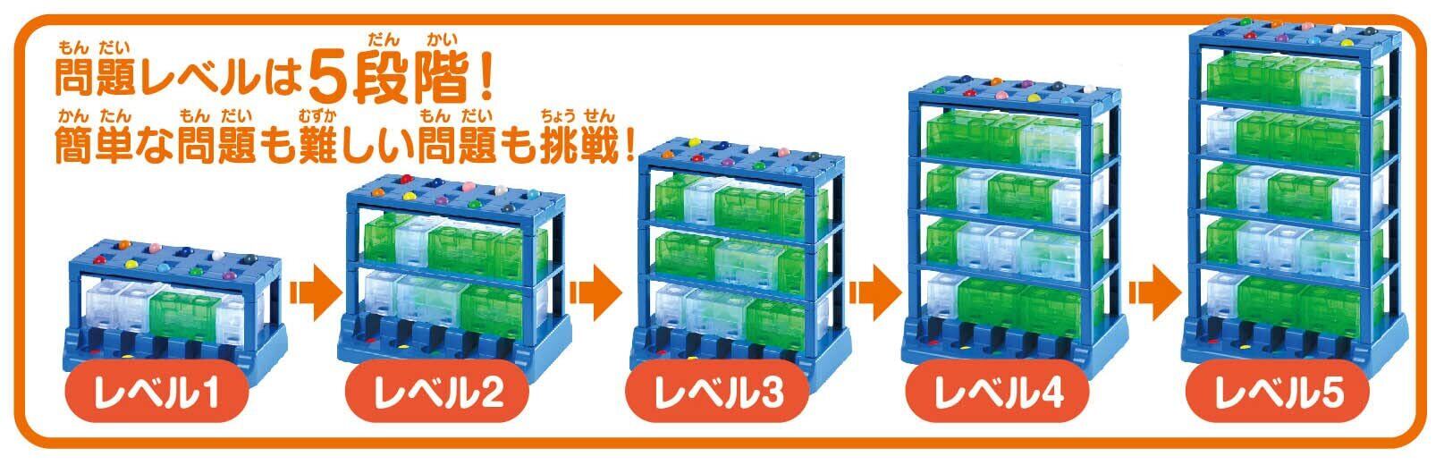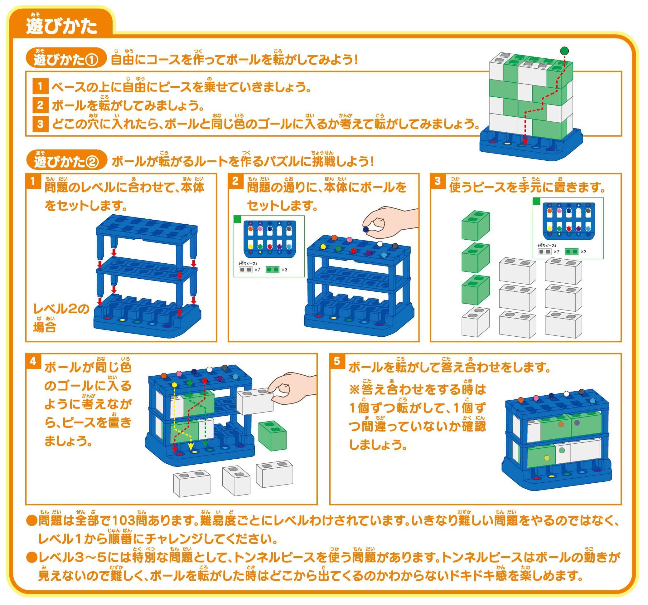 2種類のピースを組み合わせて、ボールが同じ色のゴールに入るようにルートをつくります。三次元で考え試行錯誤し論理的思考力を養う。問題レベルは5段階、ステップアップの構成で全103問。簡単な問題から難しい問題まで挑戦しましょう。