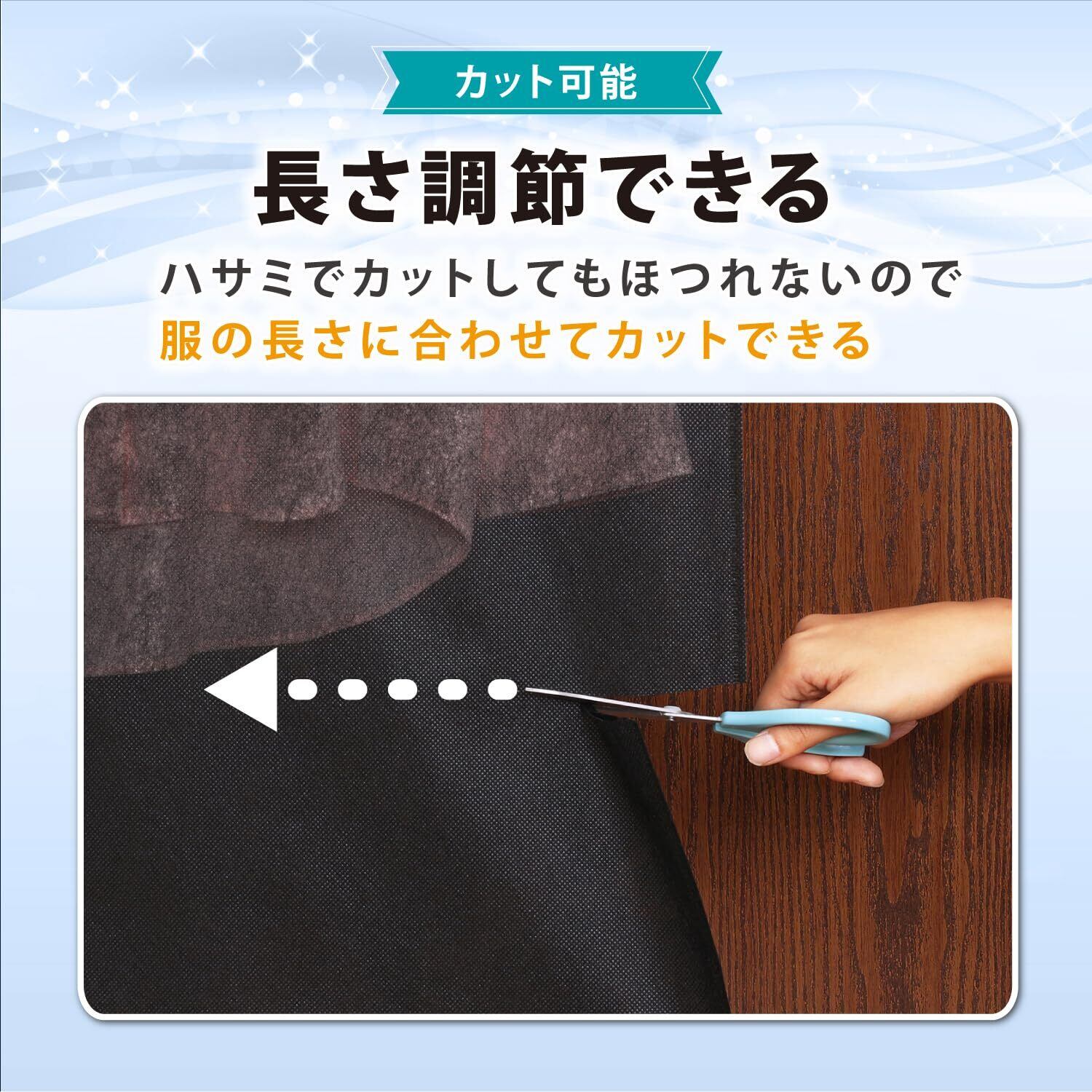 【洋服の毛玉や傷みを防ぐ・丈の長さを調節できる】:カバーを掛けておくことで保管中に洋服同士が擦れず、毛玉の発生や傷みを防げる。カバーの裾をハサミでカットすることもできるので、洋服の長さに合わせて使える。