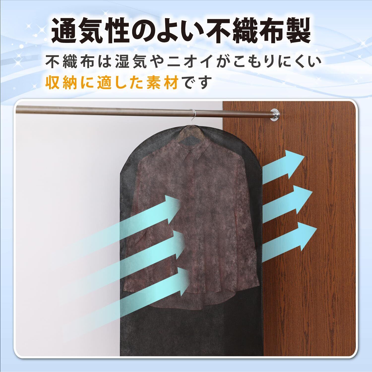 【通気性の良い不織布製ショートサイズ衣類カバー】:通気性が良く湿気やにおいのこもりにくい、ショートサイズの不織布製衣類カバー。
