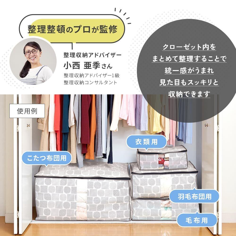 ホコリを防ぎ、おしゃれに収納。季節物の衣類の収納に便利。通気性のよい不織布製で、中身が分かる透明窓付き。クローゼットや押入れに収納しやすいサイズです。