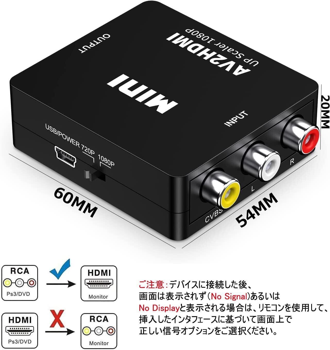 【RCA to HDMI 変換コンバーター 】 ●RCAコンポジット(赤、白、黄)入力をHDMI 720P/1080P(60HZ)出力に変換し、HDTV/モニターに表示します。 ●ドライバーは必要なくて、プラグアンドプレイするだけです。 ●【単一RCA信号から単一HDMI通信に変換のみ】【HDMI信号をコンポジット信号にする逆の使い方はできません。】【アナログ映像をPCに取り込めることには対応できません。】