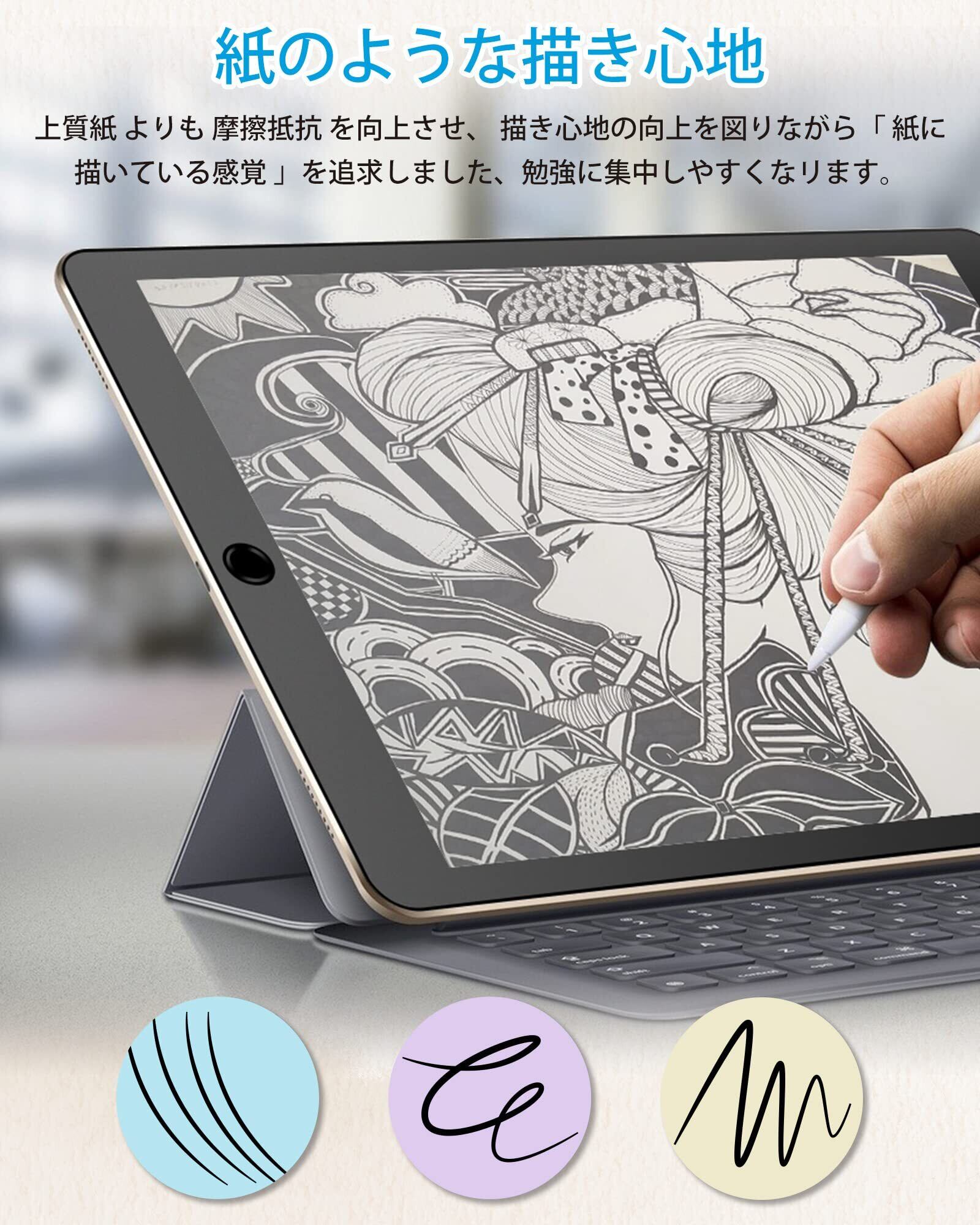 【紙のような描き心地】iPad air2 フィルムの正面に日本からの高密度素材を採用しており、紙の摩擦と抵抗があるので、iPadユーザーが紙に描くような感覚を提供して、書く、描画、ノートの書き込みなど書くことに集中できます。なお、ペーパーフィルムはApple pencilと交換性が有ります、大幅にペン先磨耗防止、Apple Pencilでのストロークが滑らかで自然に感じられるような書き心地を実現。