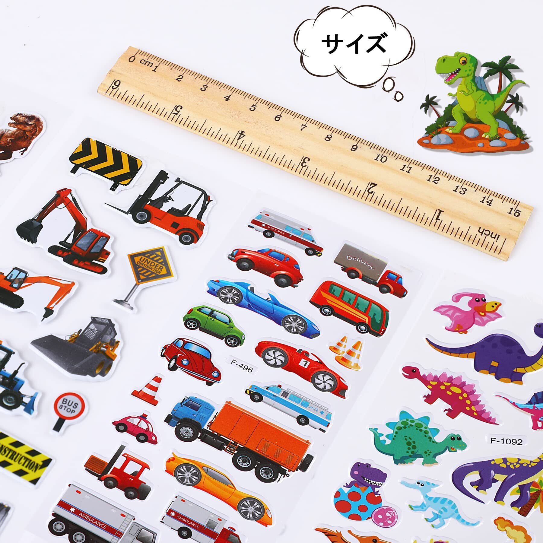 【豊富なデザイン】ステッカーのパターンは主に乗り物や恐竜ですが、デザイがそれぞれ違います。ティラノサウルス、トリケラトプス 、スピノサウルス、ブラキオサウルスなど、様々な恐竜シールがあります。車シールについては、バス、タクシー、消防車、ヘリコプター、ショベルカーなど、多様な種類の絵柄もあります。