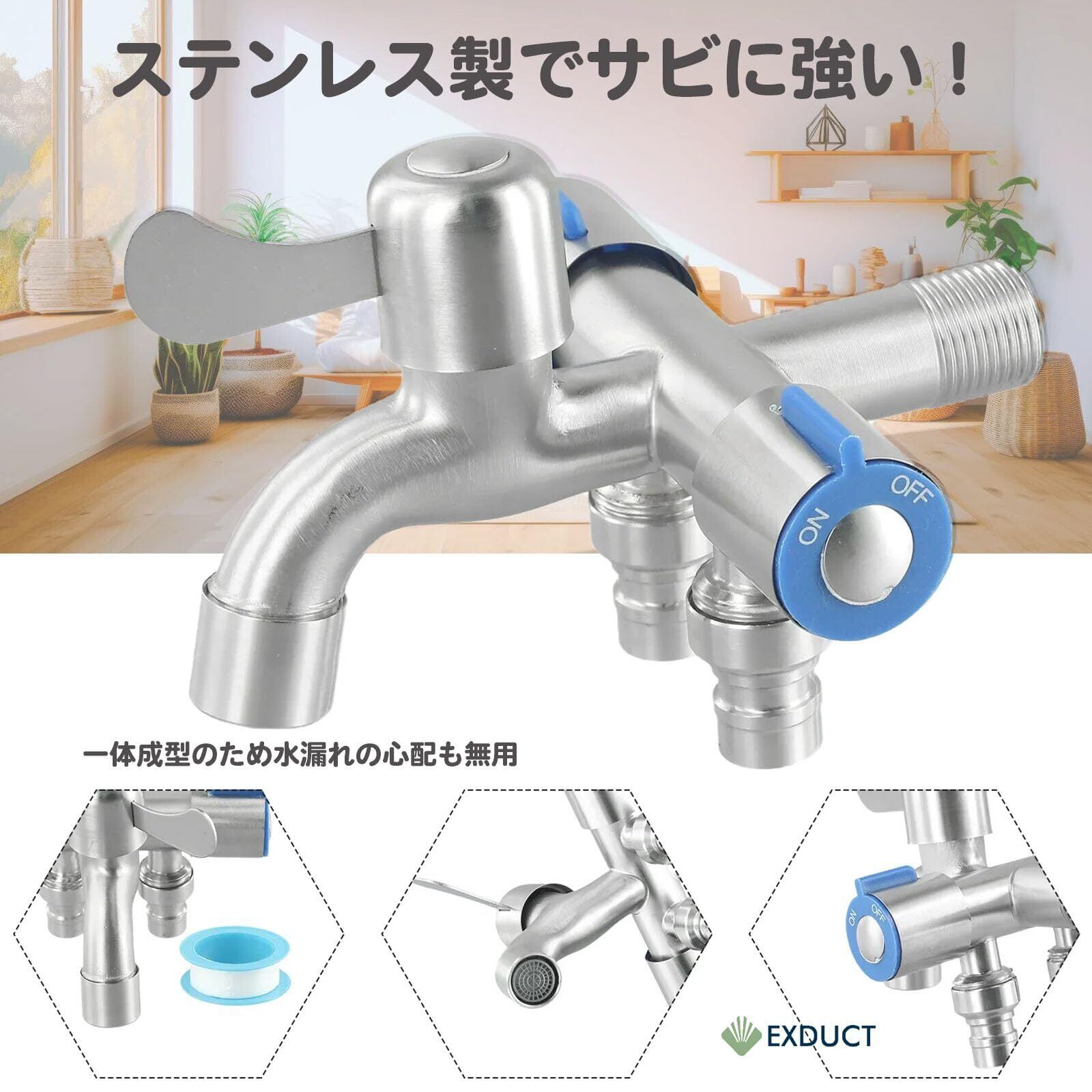 EXDUCT 3分岐蛇口 洗濯機用水栓 3分岐止水栓 ステンレス製 三股蛇口 標準G1/2 洗濯 お風呂 洗面所 浴室 ベランダ ガーデン 3口 蛇口
