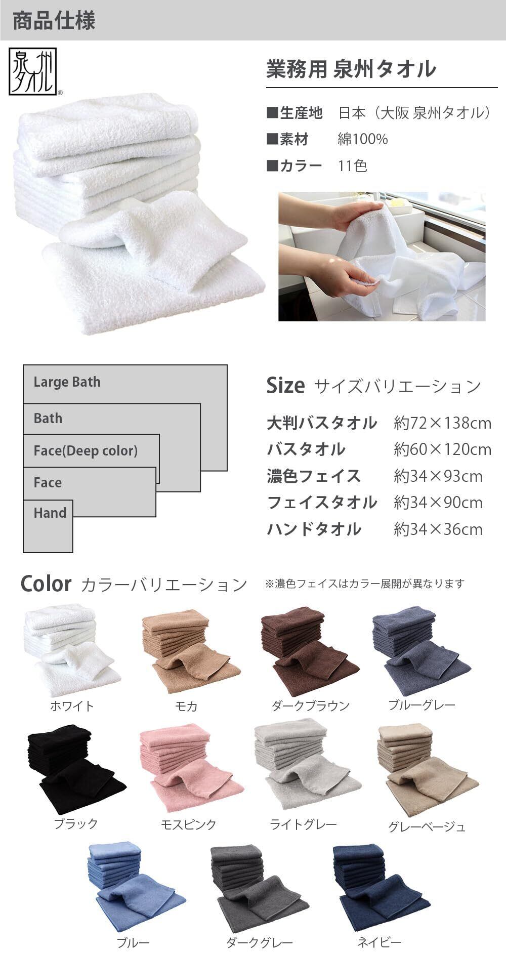 【泉州タオルセット】一般的なフェイスタオルより少し長めで使いやすいタオルです。乾きやすさと普段の使いやすさを考慮しやや薄手に織り上げています。分厚くないので乾きも早く普段使いにも。厳選した綿花を丁寧に織り上げていますので耐久性も違います!飲食店、美容院、エステ、マッサージ、ホテル、病院、介護などの業務用からご家庭でのご利用もおすすめです。 ※タグは仕様が異なる場合があります。
