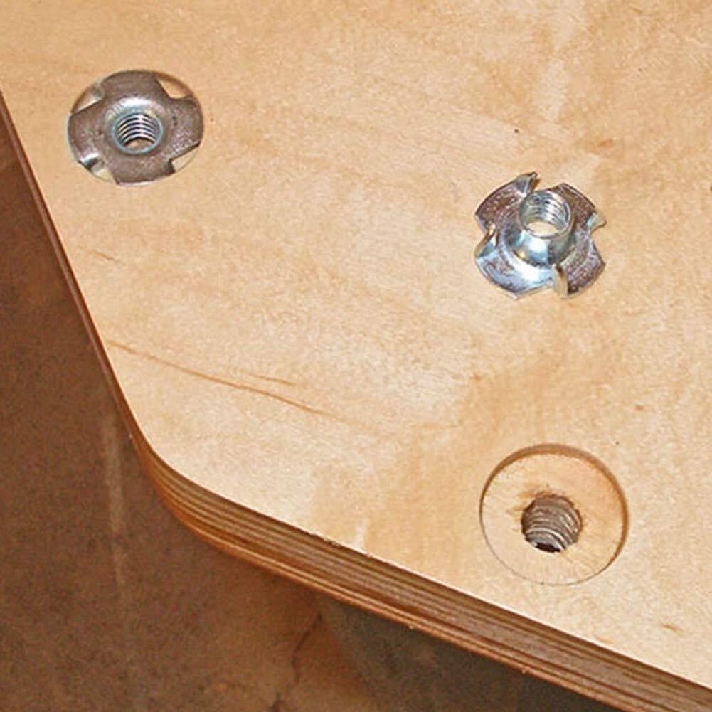 簡単インストール:ナットを適切な大きさの穴に差し込むだけで、プロングが正しい位置に固定されます。これらの4つのプロングは、Tナットが木片に挿入されて締め付けられたときに回転するのを止めます。