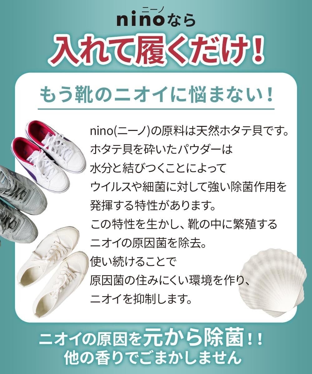 【靴のニオイに】玄関で、外出先で。その靴脱ぐのこわくないですか?nino(ニーノ)靴の消臭パウダーの原料のホタテ貝殻パウダーは、水分と結びつくと強い除菌作用を発揮し、使い続けることで原因菌の住みにくい環境を作り、ニオイを抑制します。他の香りでごまかしません。
