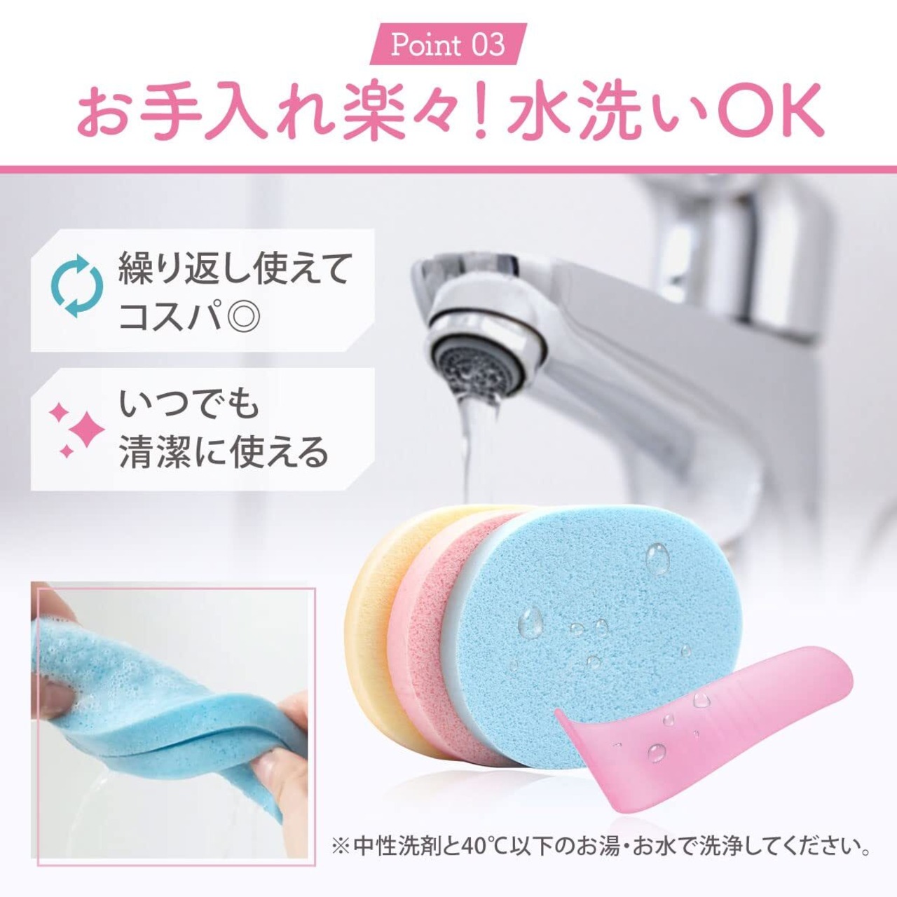 【水洗い可能で清潔】スポンジ、ヘラともに水洗いが可能で、使用後は洗浄することで何度でも使用可能です。タオル、ティッシュなどと違い消費することなく、経済的にお使いいただけます。