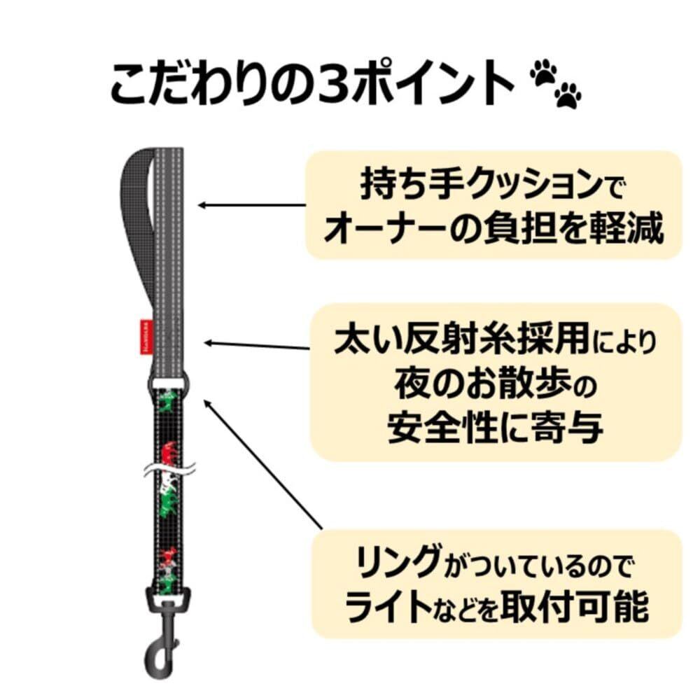 ・反射材入りの平タイプの散歩用の引紐(リード)です。 ・太い反射糸採用により夜のお散歩の安全性に寄与 ・持ち手のクッションでオーナーの負担を軽減 ・リングがついているのでライトなどを取り付け可能