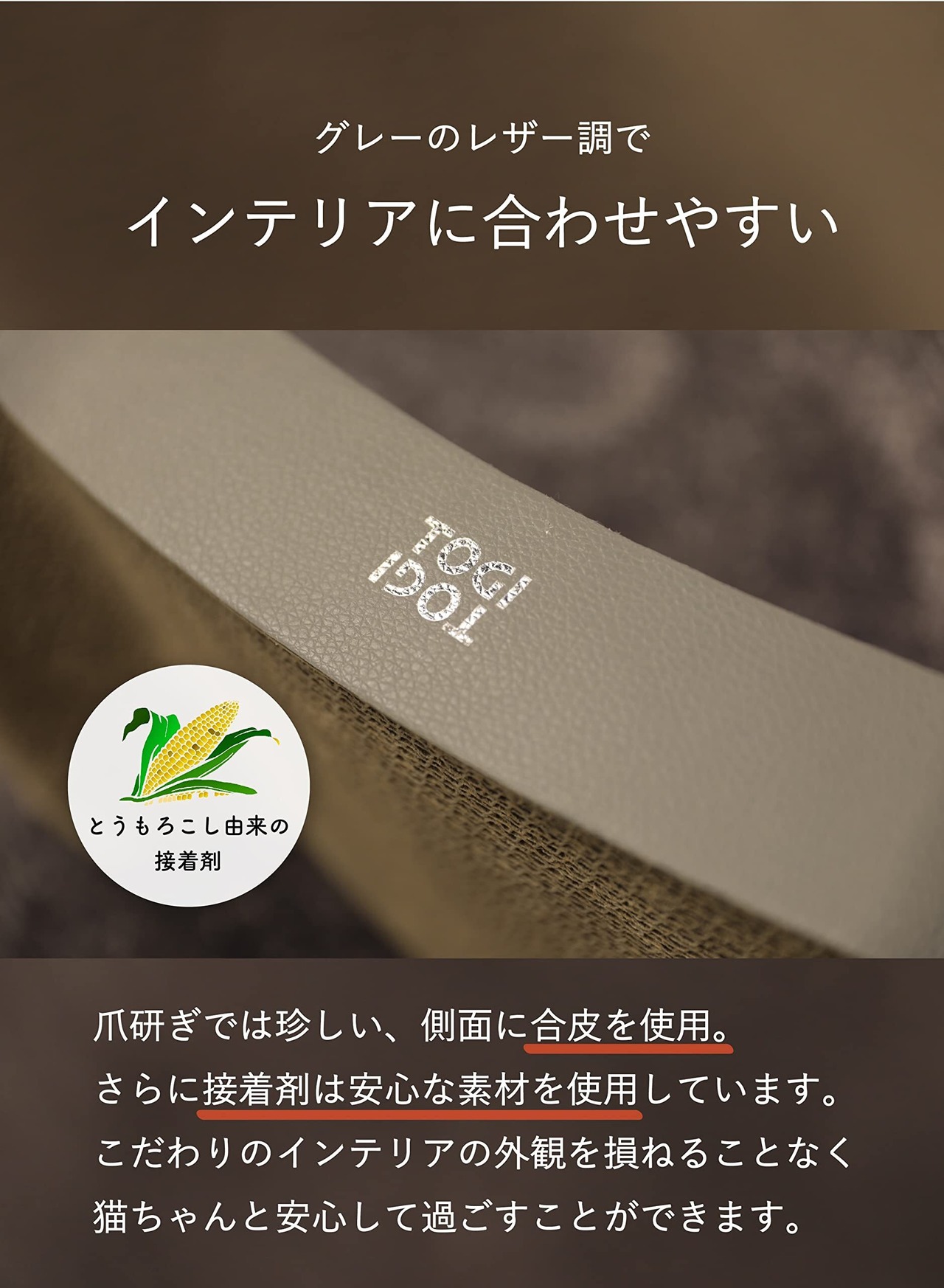 インテリアにも妥協したくない方のためのネコ用爪とぎ「TOGITOGI」段ボールの接着にはとうもろこしを主原料とした天然素材の糊を使用。自然素材なので、手や肉球をなめても安心です。