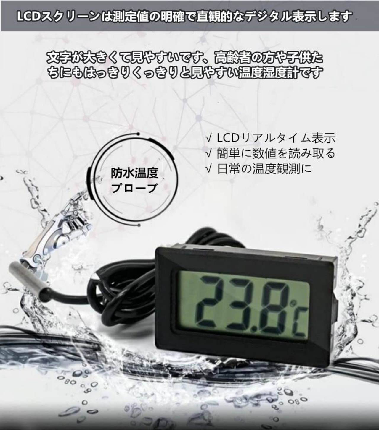 デジタルLCD温度計 温度計-50℃~110℃ プローブ付き 爬虫類テラリウム魚タンク冷蔵庫用 水槽 水温管理 水族館温度計 (ブラック 4個セット)