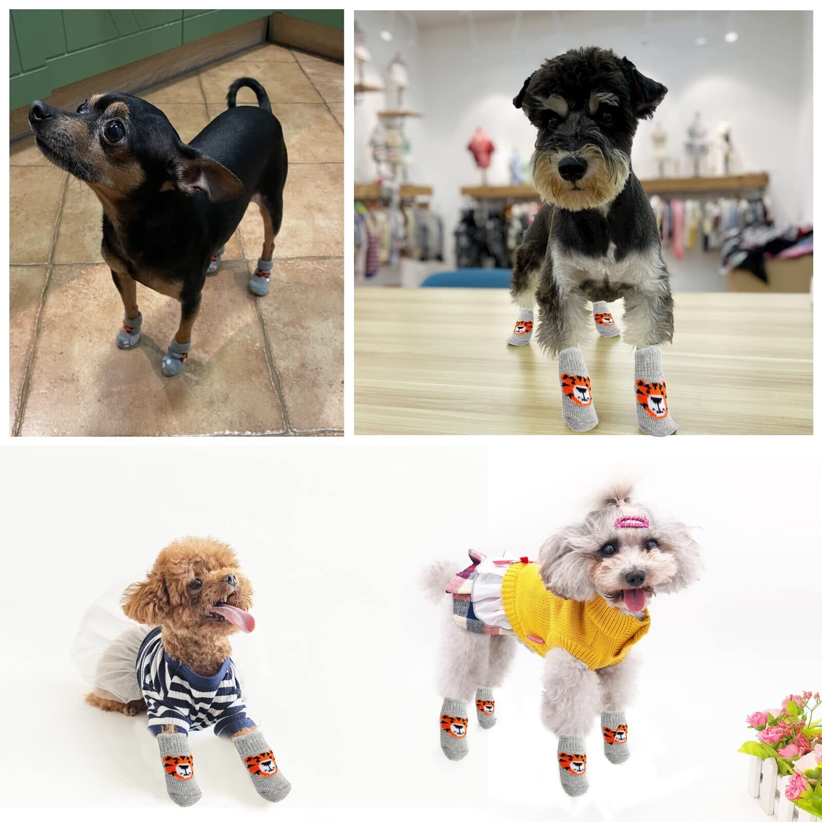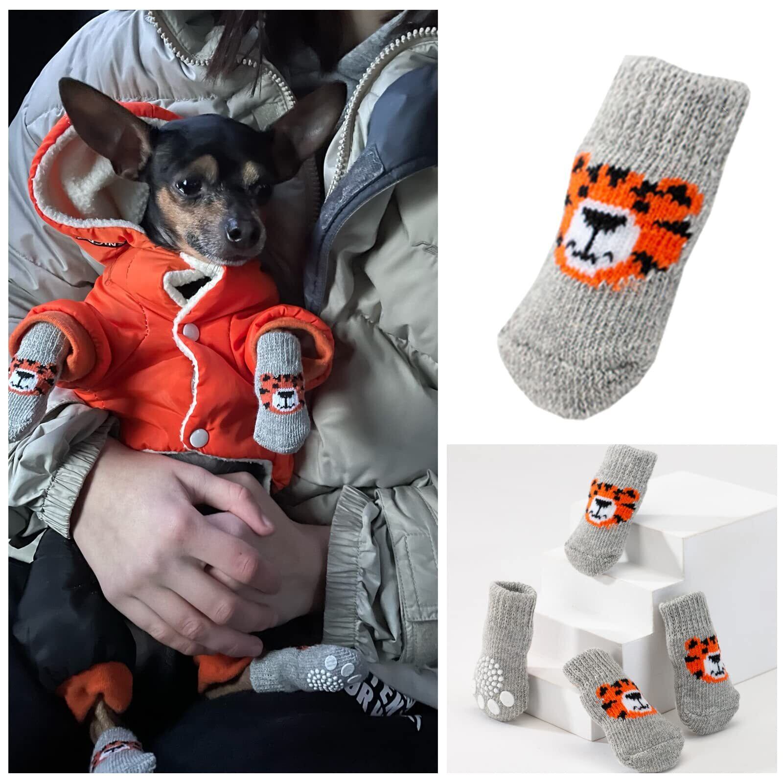 犬用靴下 滑り止め 4個セット 可愛い トラ 犬用 ソックス 柔らかい ペット 靴下 肉球保護 防寒 舐め防止 小型犬 中型犬 室内 室外 グレー (M)