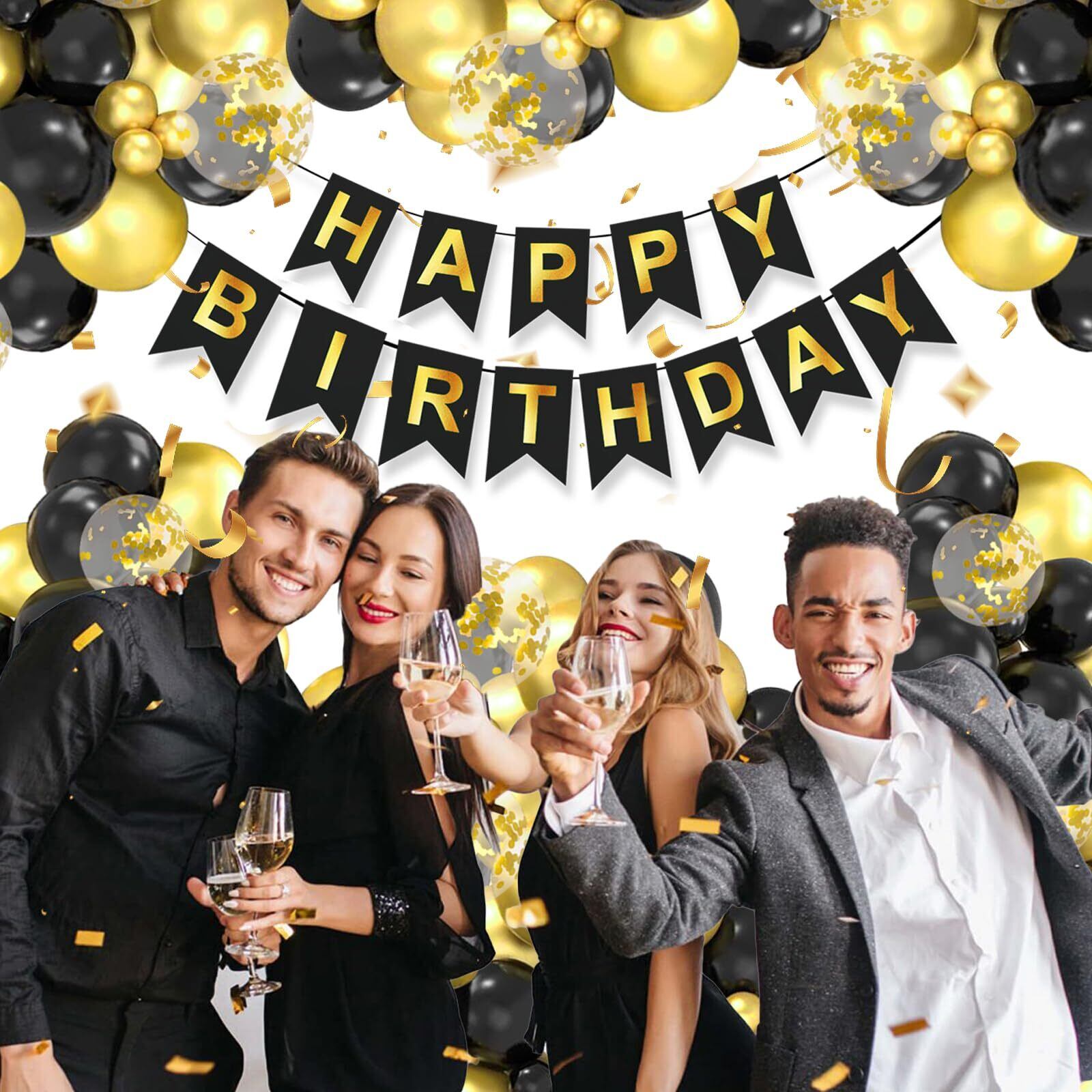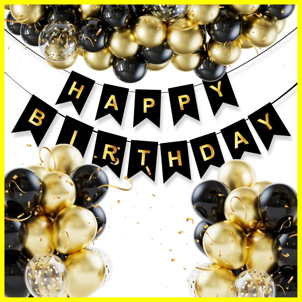 パッケージに含まれるもの:100pcs風船(黒、金、金紙吹雪)、1pcs事前にひもで縛られた大きな幸せな誕生日のバナー、1 *ドットのり、1 *バルーンストリップ、2 *リボンを含む。
