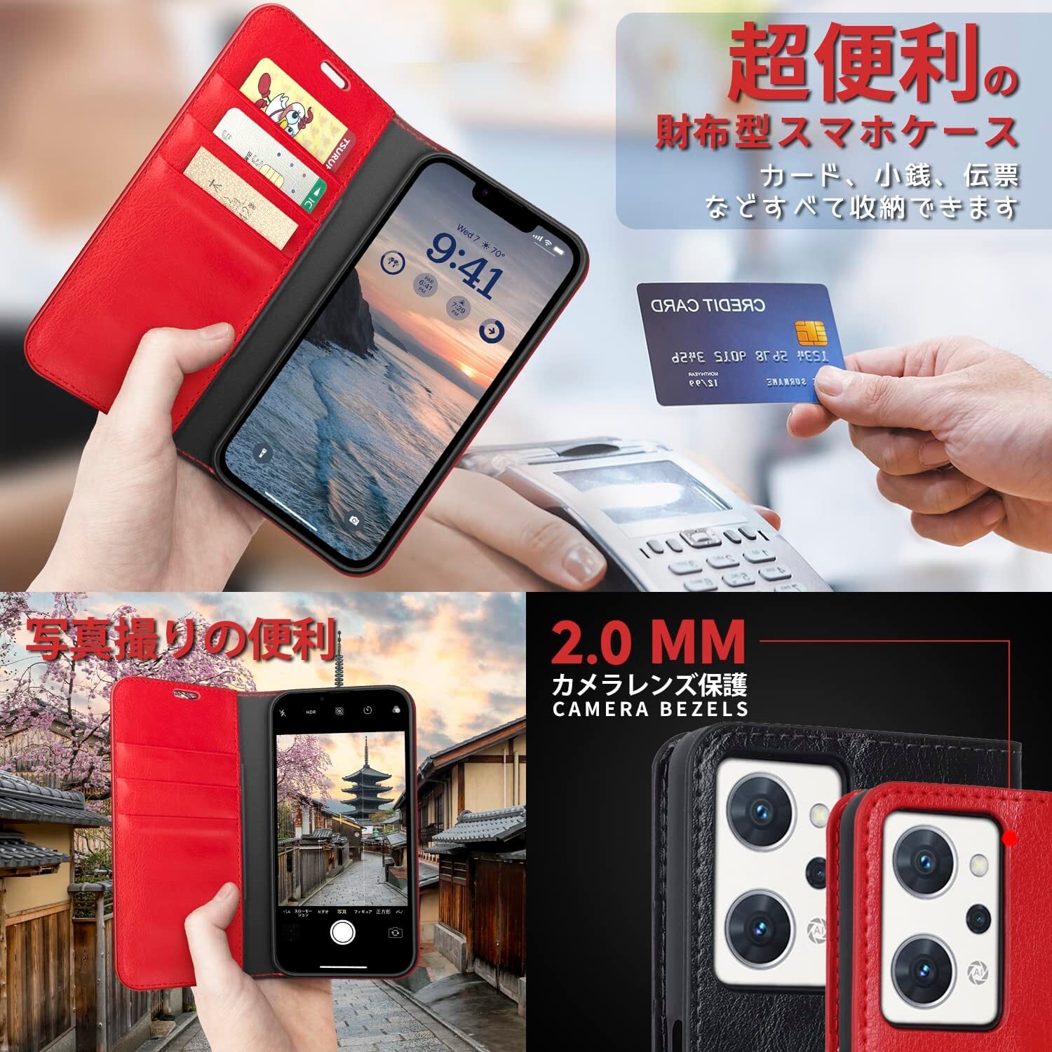 SKIASE Ymobile OPPO Reno7 A ケース 手帳ケース カバー 適用 本革 内蔵マグネットなし 携帯カバー カード入れ カードケース スタンド機能 落ち着いた色 レトロ レッド