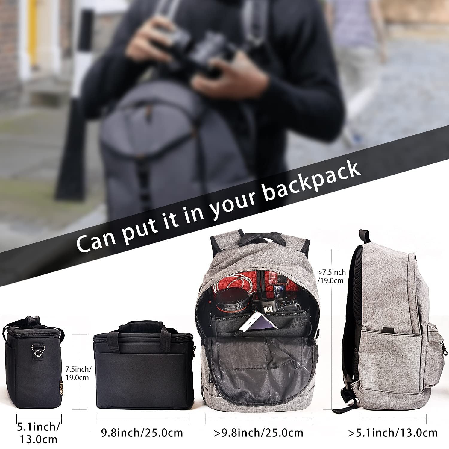 【収納容量】これはコンパクトなカメラバッグです。一つの間仕切り板がある。一つの一眼レフカメラ、一つのカメラレンズ、ケーブル、モバイル電源、メモリーカード、スマホ、その他の小物を収納できます。マジックテープ仕切りで、カメラやレンズを収納して保護します。フロントのファスナーポケットは出し入れしやすいアイテムを収納できます。