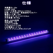 【LEDブラックライト・強力タイプ】高出力・高性能のUV-LEDを24個搭載した紫外線ブラックライトです。広い面積が照らせ、広い範囲が見えるので使いやすいです。仕様:32cm* 3.3cm * 2.3cm 重さ:約160g 照射角度;200度、USBケーブル長さ: 1.6 M 消費電力: 10 W 波長: 385 ~410 nm 。