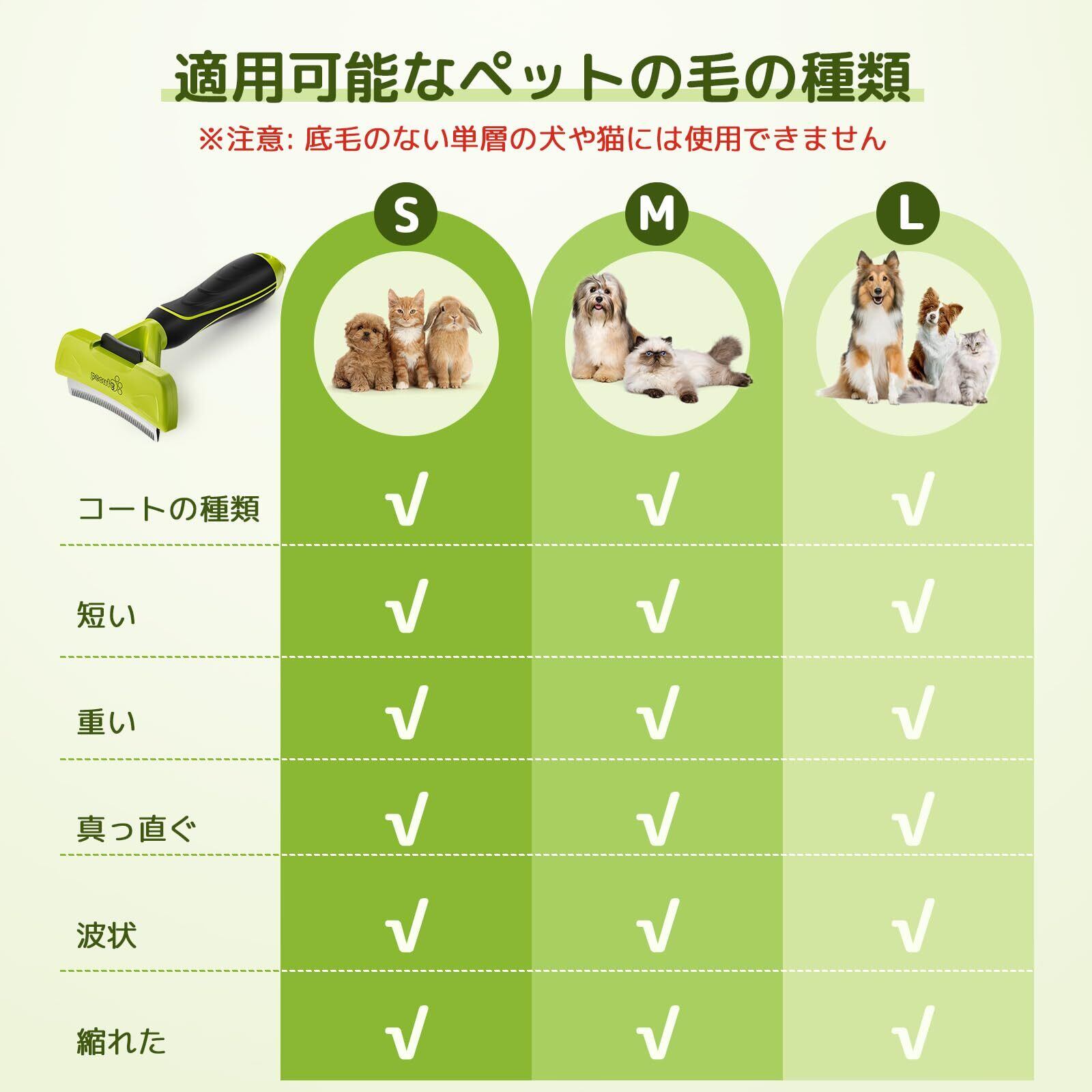 【安全で丈夫な素材】ペットブラシ本体はABSとTPRの環境に優しい素材を採用しており、安心してご使用いただけます。 304ステンレス鋼の刃、錆びず、長期間使用できます。 また、独自の刃の設計により、使用中にペットの皮膚を傷つけません。※ 但し、ワンちゃんの背中をブラッシングする際、刃が背骨にあたると痛いので優しく、ゆっくりとブラッシングしてください。