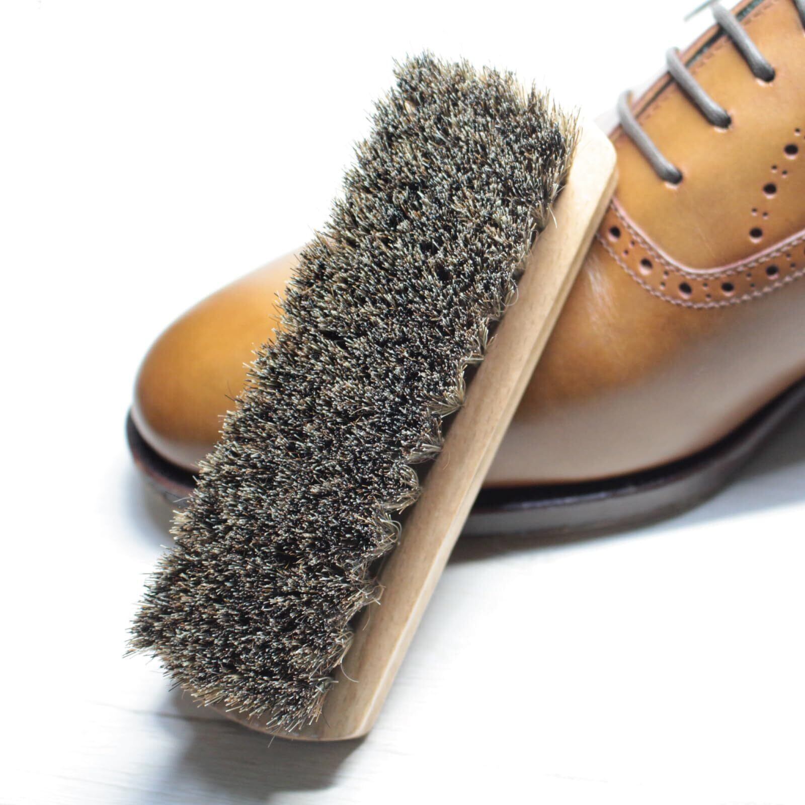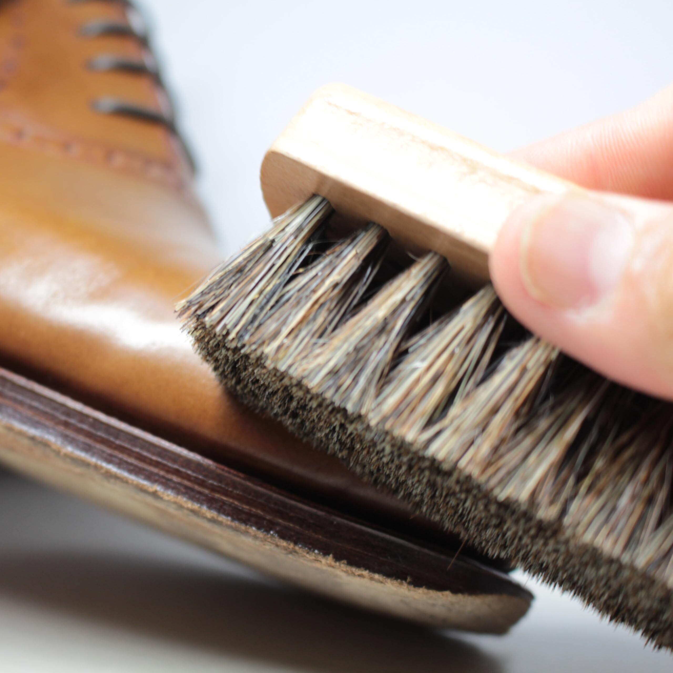 布 や スポンジ でクリームを添付した後の仕上げに 靴クリームを塗った後、 ブラッシングすると 靴になじみ、伸ばすことにより光沢もでます。馬毛は革靴に馴染みしっかりと靴に光沢感を与えます。