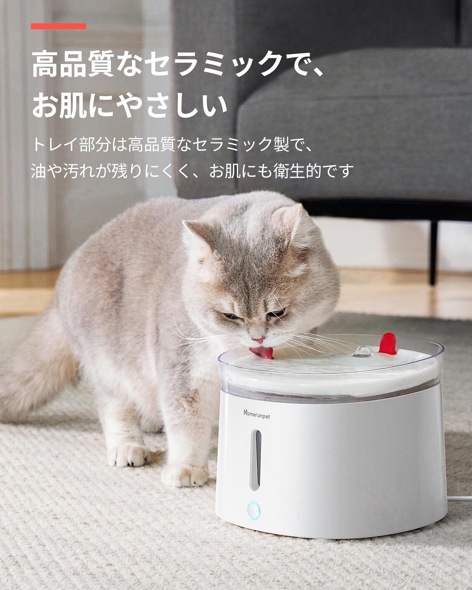 Homerunpet 猫 犬 ペット 自動給水器 セラミック 静音 ワイヤレスポンプ 大容量2L 2つの給水モード 組み立て簡単 お手入れ簡単 フィルター付き LEDライト 給水器 水飲み器 スマートペット家電