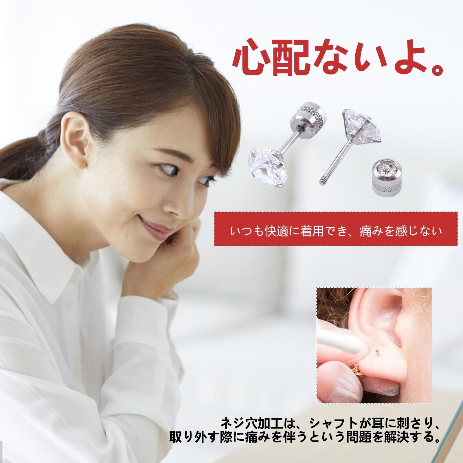 【ねじ式キャッチ】 ねじ式のキャッチは外れにくく安心。付けたままで寝がえりを打ってもピアスが耳の裏にささらないから痛くありません。しっかり固定できて外れないからプールやお風呂、スポーツなど 様々なシーンでお洒落を楽しめます。