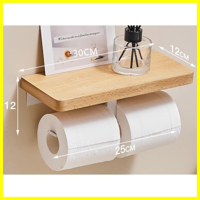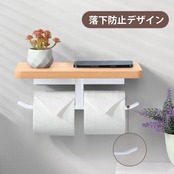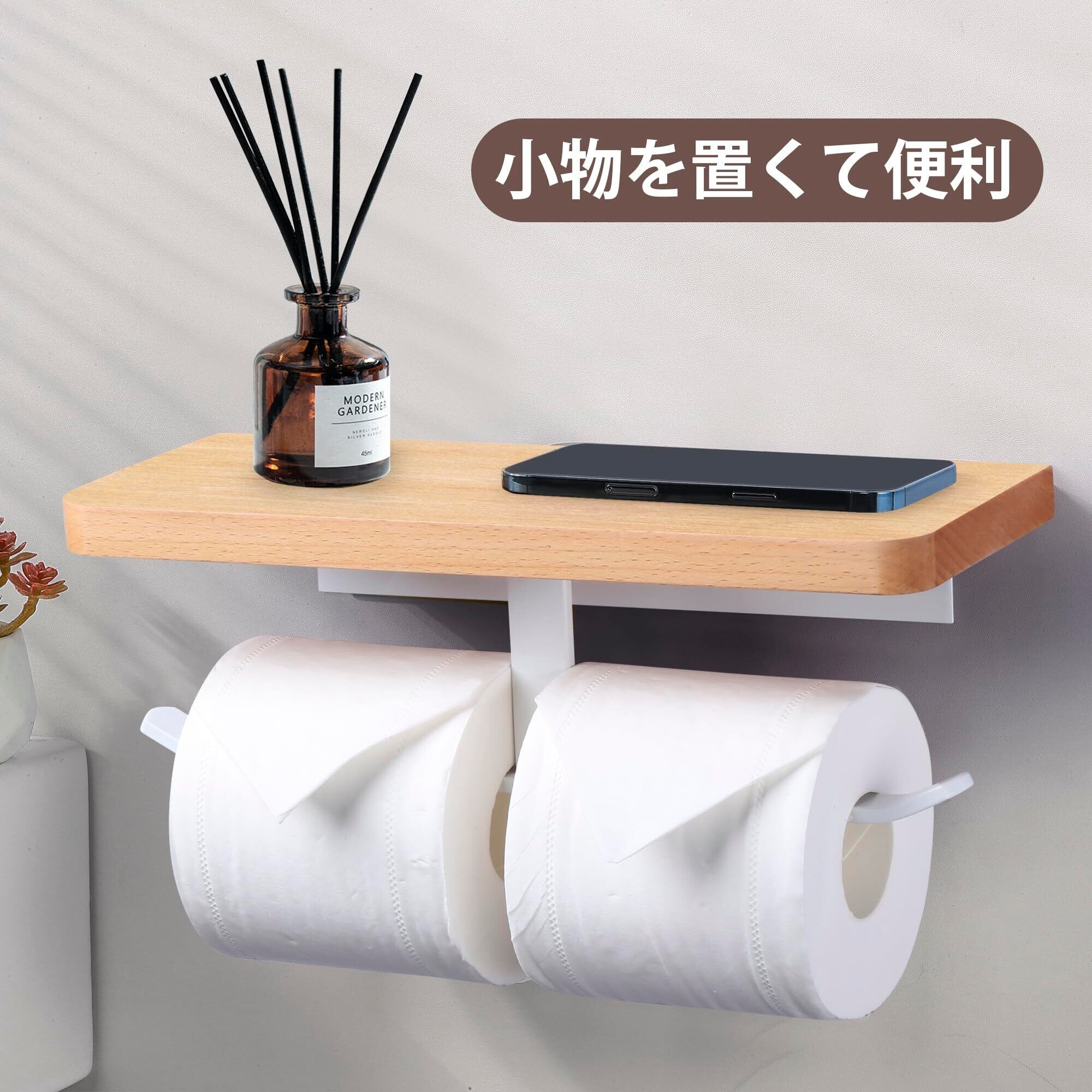 トイレットペーパーホルダー 紙巻器 小物置き/スマホ置き 汚れに強い天板付き 棚付き 取り付け簡単 壁掛け 穴あけ不要 貼り付け 横から簡単取り替え 天然木 おしゃれ 浴室 耐荷重約5kg ホワイトフック 白色