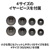 小さな耳にもフィットしやすいXSサイズを含む、4サイズのイヤーピース付属(XS/S/M/L)