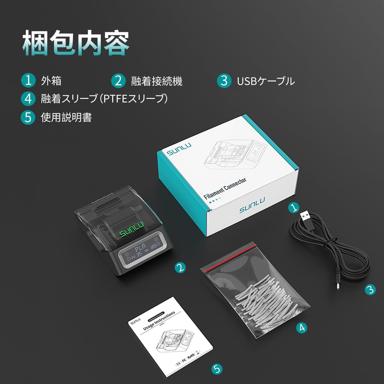 SUNLU フィラメントコネクター、フィラメントスプライサー PTFEスリーブ200個付き 3Dプリンター用フィラメント 1.75mm、最大240°Cの高速加熱、PLA PETG TPU ABS PAナイロンに対応